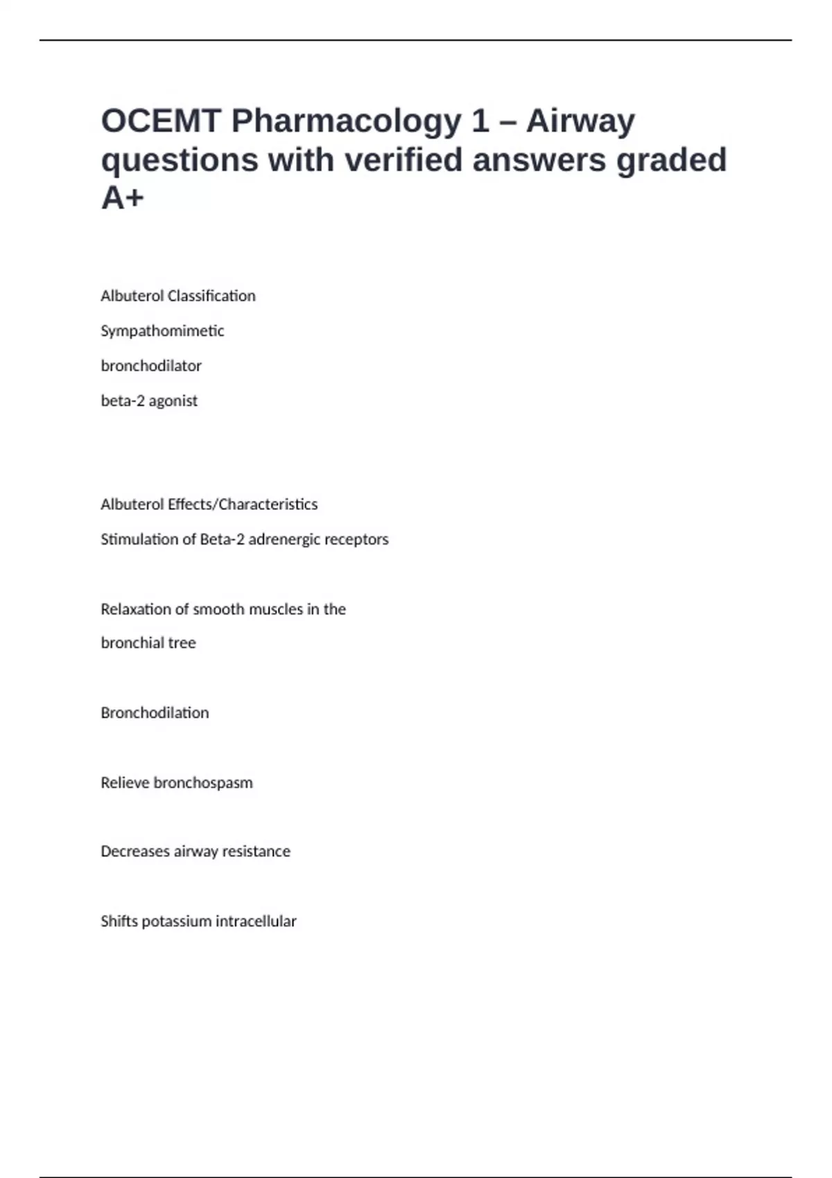 OCEMT Pharmacology 1 – Airway questions with verified answers graded A+