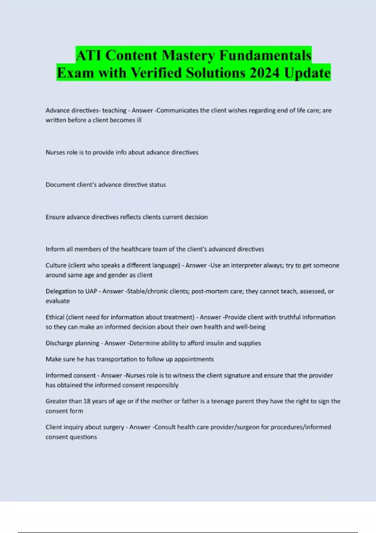 ATI Content Mastery Fundamentals Exam with Verified Solutions 2024 Update Advance directives- teaching - Answer -Communicates the client wishes regarding end of life care; are written before a client becomes ill Nurses role is to provide info about advance directives Document client's advance directive status Ensure advance directives reflects clients current decision Inform all members of the healthcare team of the client's advanced directives Culture (client who speaks a different language) - Answer -Use an interpreter always; try to get someone around same age and gender as client Delegation to UAP - Answer -Stable/chronic clients; post-mortem care; they cannot teach, assessed, or evaluate Ethical (client need for information about treatment) - Answer -Provide client with truthful information so they can make an informed decision about their own health and well-being Discharge planning - Answer -Determine ability to afford insulin and supplies Make sure he has transportation to follow up appointments Informed consent - Answer -Nurses role is to witness the client signature and ensure that the provider has obtained the informed consent responsibly Greater than 18 years of age or if the mother or father is a teenage parent they have the right to sign the consent form Client inquiry about surgery - Answer -Consult health care provider/surgeon for procedures/informed consent questions Telephone prescriptions are - Answer -Must write the order down before reading it back to the provider Identify Improper documentation - Answer -Documenting should be factual Subjective data documentation - Answer -Quotes with quotation marks- what the client states to the nurse Objective data documentation - Answer -What the nurses, smells, osculates do not use derogatory words, judgment, or opinions Intentional tort - Answer -Doing harm (The act must be intentional, not merely reckless or careless) Assault, battery, false imprisonment, invasion of privacy, slander Interprofessional team member consult - Answer -PT- consulted for mobility issues OT- assist clients to regain ADL skills ST- Deals with speech and language disorders Coordinated client care among healthcare team - Answer -Social worker- Coordinates care and community resources Demonstrating client advocacy - Answer -Nurses role is to provide support of the clients health, wellness, safety, and personal rights, including privacy Nursing role- client observation - Answer -Share appropriate information among team members Prioritizing client care - Answer -Follow ABC's (airway, breathing, circulation) Unstable are seen before stable clients Acute clients are seen before chronic clients Ethical dilemma - Answer -Follow autonomy, beneficence, Fidelity, justice, nonmaleficence, and veracity principles Disposition of valuables (Admit/transfer/DC) - Answer -Personal items include clothing, jewelry, money, credit cards, hearing aides, eyeglasses, dentures, etc Discourage the client from keeping valuables at bedside Document communication with the client related to items left within the room Valuables should be locked in the facilities safe Identify negligence - Answer -Failure to provide care as defined by a standard Breach of duty Foreseeability of harm Caused harm Latex allergy - Answer -Schedule first on the morning operating list (OR must be free from powdered latex gloves for at least 3 hours prior to surgery) Synthetic gloves must be used