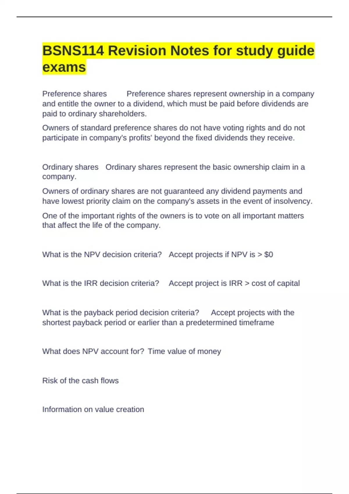 What does NPV account for? Time value of money