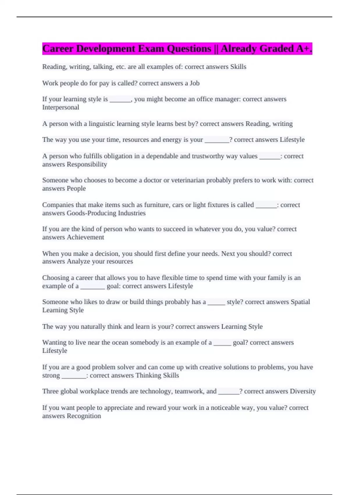 Reading, writing, talking, etc. are all examples of: correct answers Skills Work people do for pay is called? correct answers a Job If your learning style is ______, you might become an office manager: correct answers Interpersonal A person with a linguistic learning style learns best by? correct answers Reading, writing The way you use your time, resources and energy is your _______? correct answers Lifestyle A person who fulfills obligation in a dependable and trustworthy way values ______: correct answers Responsibility Someone who chooses to become a doctor or veterinarian probably prefers to work with: correct answers People Companies that make items such as furniture, cars or light fixtures is called ______: correct answers Goods-Producing Industries If you are the kind of person who wants to succeed in whatever you do, you value? correct answers Achievement When you make a decision, you should first define your needs. Next you should? correct answers Analyze your resources Choosing a career that allows you to have flexible time to spend time with your family is an example of a _______ goal: correct answers Lifestyle Someone who likes to draw or build things probably has a _____ style? correct answers Spatial Learning Style The way you naturally think and learn is your? correct answers Learning Style Wanting to live near the ocean somebody is an example of a _____ goal? correct answers Lifestyle If you are a good problem solver and can come up with creative solutions to problems, you have strong _______: correct answers Thinking Skills Three global workplace trends are technology, teamwork, and ______? correct answers Diversity If you want people to appreciate and reward your work in a noticeable way, you value? correct answers Recognition