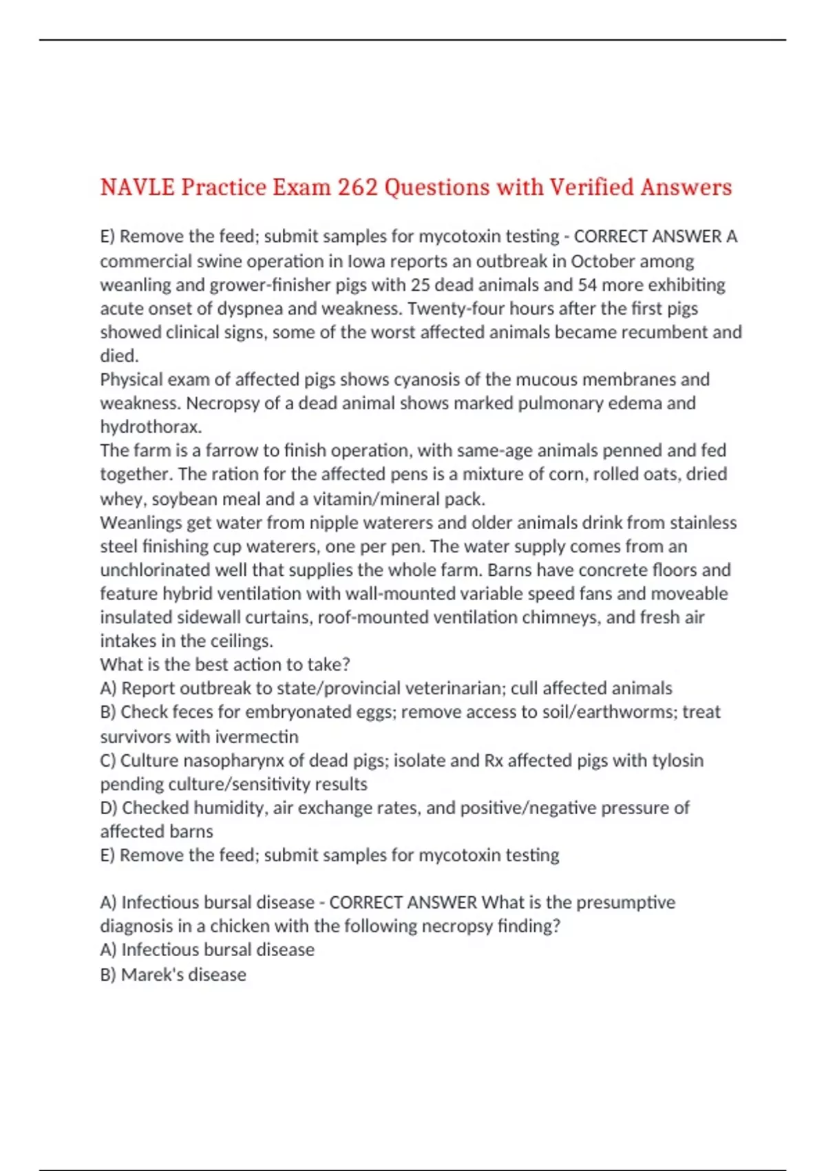 NAVLE Practice Exam 262 Questions with Verified Answers E) Remove the feed; submit samples for mycotoxin testing - CORRECT ANSWER A commercial swine operation in Iowa reports an outbreak in October among weanling and grower-finisher pigs with 25 dead animals and 54 more exhibiting acute onset of dyspnea and weakness. Twenty-four hours after the first pigs showed clinical signs, some of the worst affected animals became recumbent and died. Physical exam of affected pigs shows cyanosis of the mucous membranes and weakness. Necropsy of a dead animal shows marked pulmonary edema and hydrothorax. The farm is a farrow to finish operation, with same-age animals penned and fed together. The ration for the affected pens is a mixture of corn, rolled oats, dried whey, soybean meal and a vitamin/mineral pack. Weanlings get water from nipple waterers and older animals drink from stainless steel finishing cup waterers, one per pen. The water supply comes from an unchlorinated well that supplies the whole farm. Barns have concrete floors and feature hybrid ventilation with wall-mounted variable speed fans and moveable insulated sidewall curtains, roof-mounted ventilation chimneys, and fresh air intakes in the ceilings. What is the best action to take? A) Report outbreak to state/provincial veterinarian; cull affected animals B) Check feces for embryonated eggs; remove access to soil/earthworms; treat survivors with ivermectin C) Culture nasopharynx of dead pigs; isolate and Rx affected pigs with tylosin pending culture/sensitivity results D) Checked humidity, air exchange rates, and positive/negative pressure of affected barns E) Remove the feed; submit samples for mycotoxin testing A) Infectious bursal disease - CORRECT ANSWER What is the presumptive diagnosis in a chicken with the following necropsy finding? A) Infectious bursal disease B) Marek's disease C) Renal dystrophy D) Histomoniasis E) Avian spirochetosis C) Neomycin - CORRECT ANSWER Which of these drugs has the greatest potential for causing acute renal failure in the horse? A) Xylazine B) Diphenhydramine C) Neomycin D) Oxytetracycline E) Dexamethasone E) Full body lyme sulfur dip - CORRECT ANSWER A middle aged MN stray cat is left on the doorstep of your clinic. The cat has a large dry crusted area of alopecia over his nose. A skin scraping of the area is negative. The lesion fluoresces under Wood's lamp examination. Which of the following would be the best treatment? A) Povidone-iodine scrub B) Lufenuron C) Doxycycline D) Athlete's foot cream (clotrimazole) E) Full body lyme sulfur dip, itraconazole
