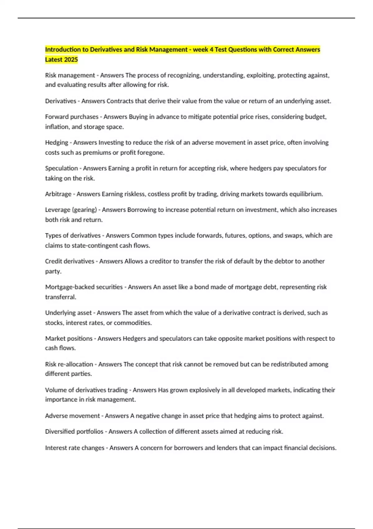 Derivatives - Answers Contracts that derive their value from the value or return of an underlying asset.