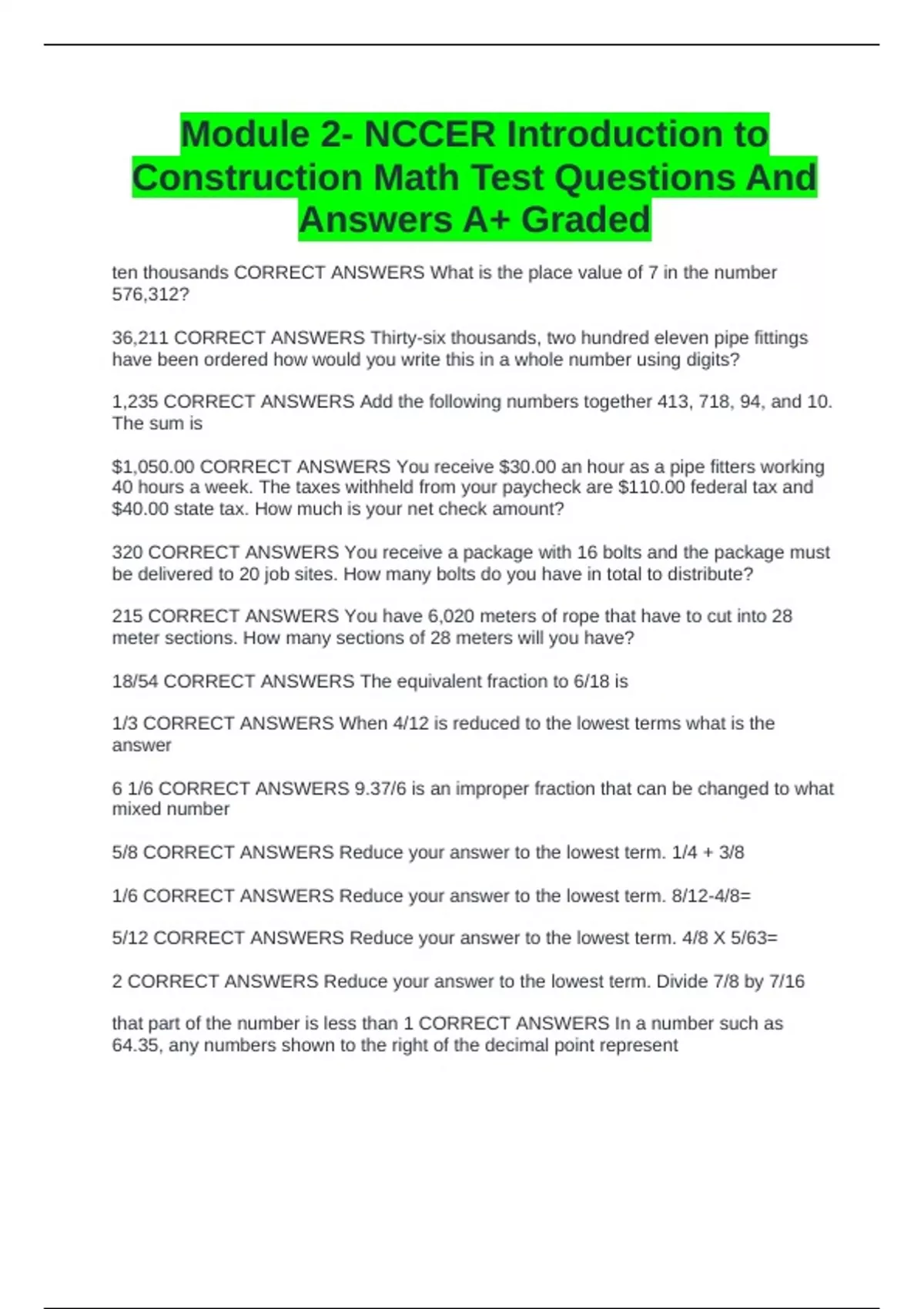 Module 2- NCCER Introduction to Construction Math Test Questions And Answers A+ Graded