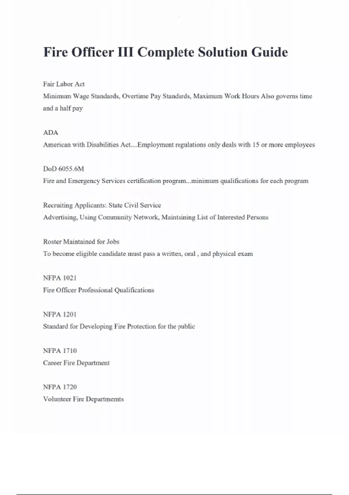 Fire Officer III Complete Solution Guide Fair Labor Act Minimum Wage Standards, Overtime Pay Standards, Maximum Work Hours Also governs time and a half pay ADA American with Disabilities Act....Employment regulations only deals with 15 or more employees DoD 6055.6M Fire and Emergency Services certification program...minimum qualifications for each program Recruiting Applicants: State Civil Service Advertising, Using Community Network, Maintaining List of Interested Persons Roster Maintained for Jobs To become eligible candidate must pass a written, oral , and physical exam NFPA 1021 Fire Officer Professional Qualifications NFPA 1201 Standard for Developing Fire Protection for the public NFPA 1710 Career Fire Department