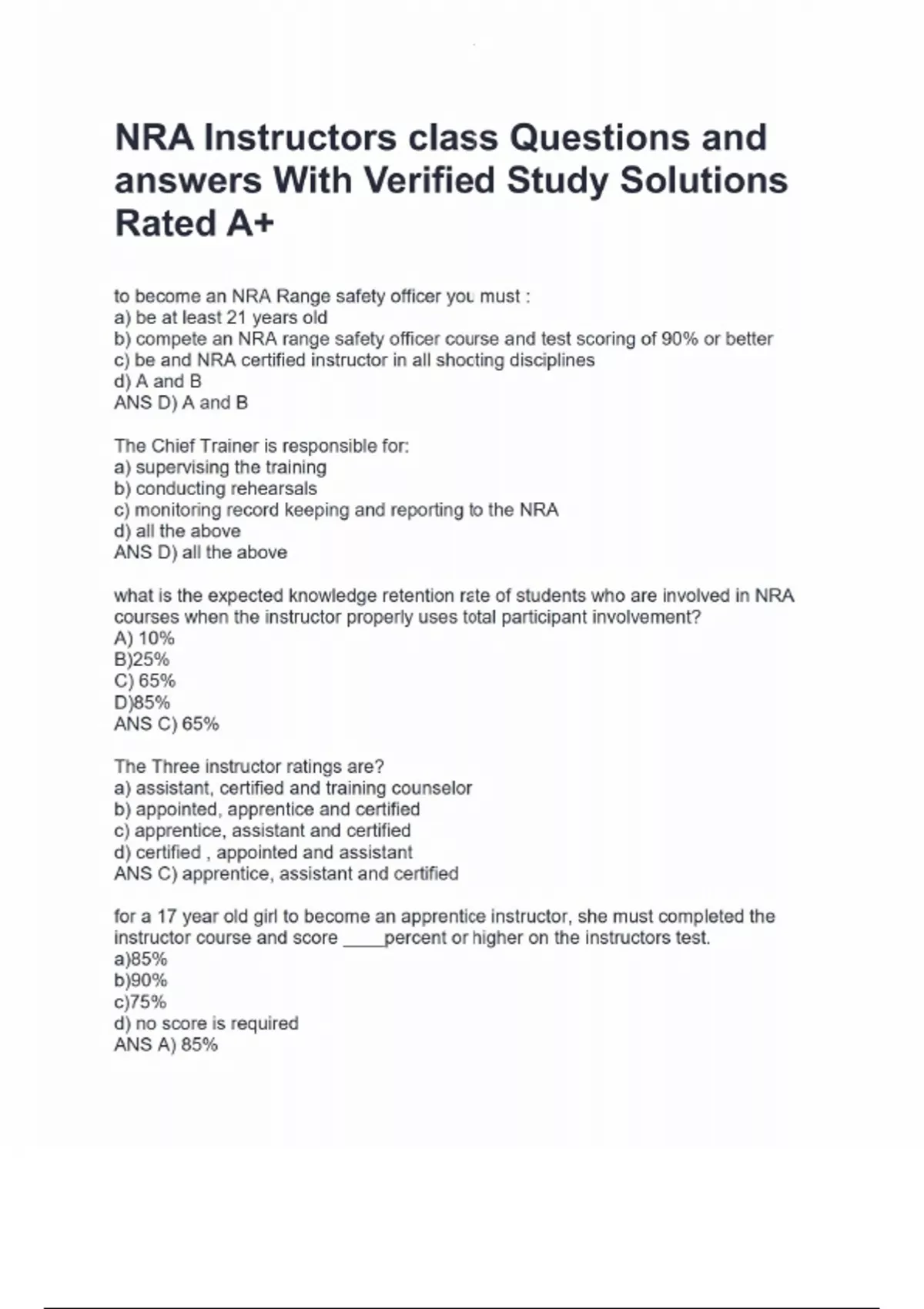 NRA Instructors class Questions and answers With Verified Study Solutions Rated A+ to become an NRA Range safety officer you must : a) be at least 21 years old b) compete an NRA range safety officer course and test scoring of 90% or better c) be and NRA certified instructor in all shooting disciplines d) A and B ANS D) A and B The Chief Trainer is responsible for: a) supervising the training b) conducting rehearsals c) monitoring record keeping and reporting to the NRA d) all the above ANS D) all the above what is the expected knowledge retention rate of students who are involved in NRA courses when the instructor properly uses total participant involvement? A) 10% B)25% C) 65% D)85% ANS C) 65% The Three instructor ratings are? a) assistant, certified and training counselor b) appointed, apprentice and certified c) apprentice, assistant and certified d) certified , appointed and assistant ANS C) apprentice, assistant and certified