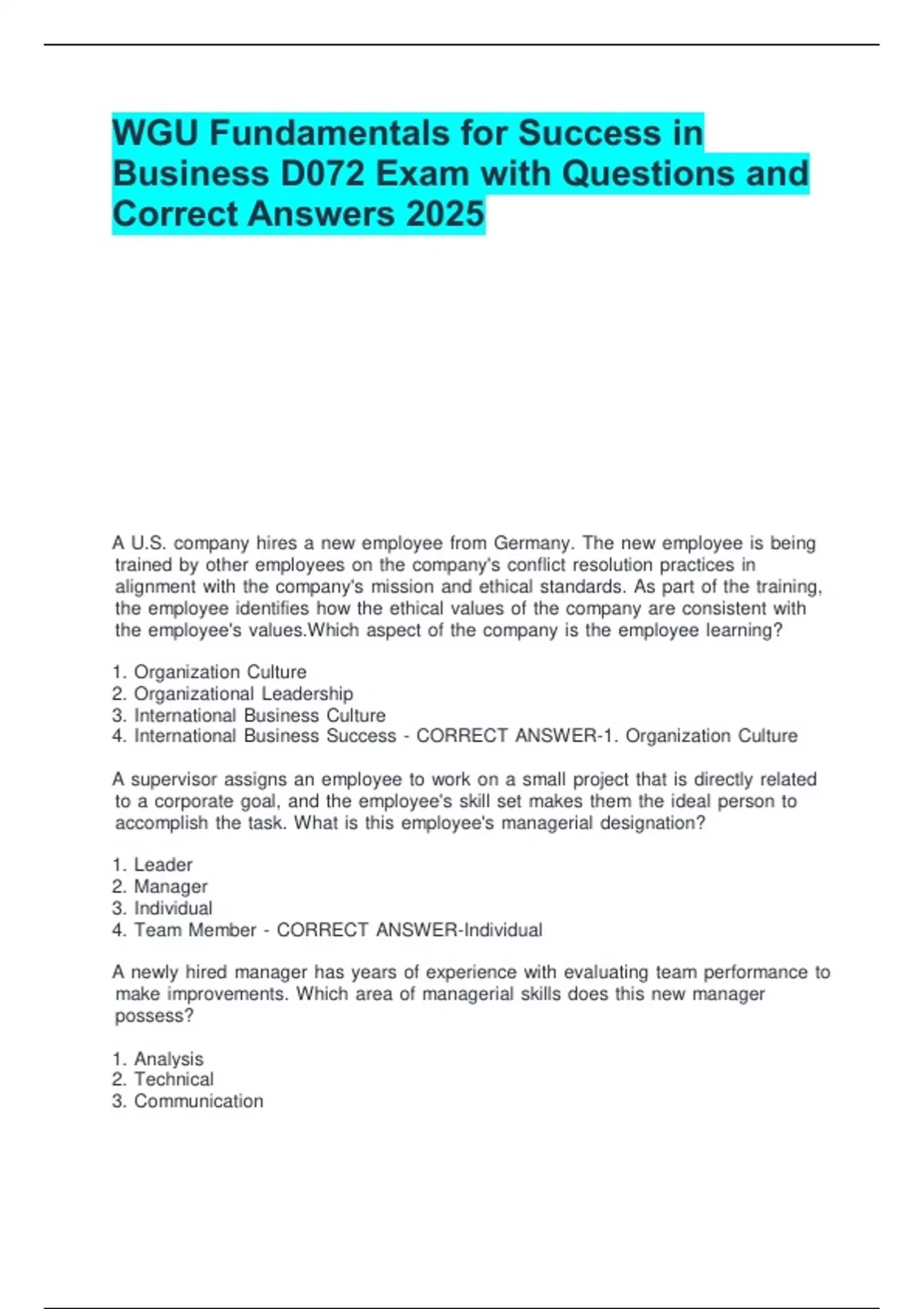 WGU Fundamentals for Success in Business D072 Exam with Questions and Correct Answers 2025. WGU Fundamentals for Success in Business D072 Exam with Questions and Correct Answers 2025.WGU Fundamentals for Success in Business D072 Exam with Questions and Correct Answers 2025.WGU Fundamentals for Success in Business D072 Exam with Questions and Correct Answers 2025.WGU Fundamentals for Success in Business D072 Exam with Questions and Correct Answers 2025.