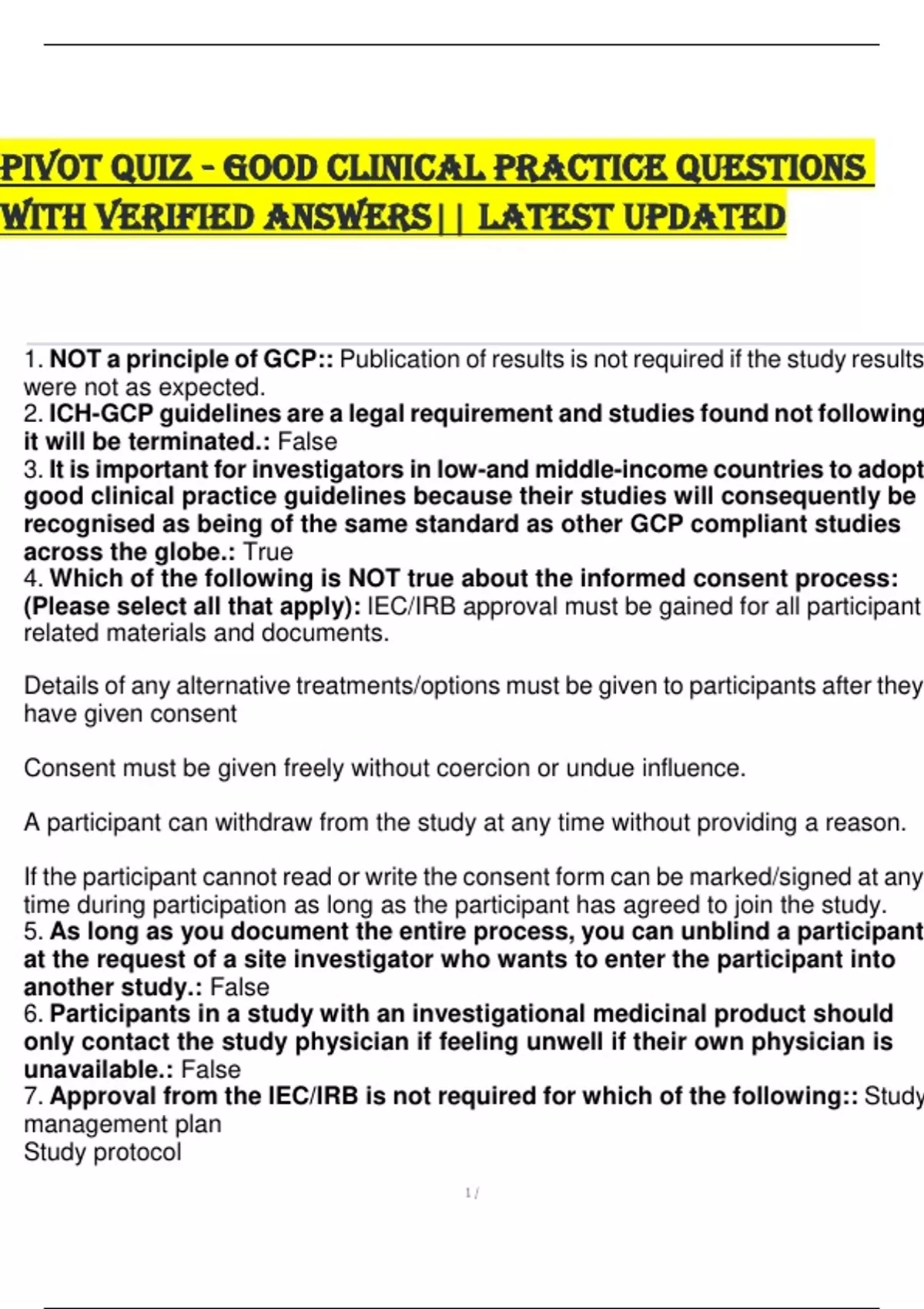 PIVOT QUIZ - GOOD CLINICAL PRACTICE QUESTIONS WITH VERIFIED ANSWERS|| LATEST UPDATED 1. NOT a principle of GCP:: Publication of results is not required if the study results were not as expected. 2. ICH-GCP guidelines are a legal requirement and studies found not following it will be terminated.: False 3. It is important for investigators in low-and middle-income countries to adopt good clinical practice guidelines because their studies will consequently be recognised as being of the same standard as other GCP compliant studies across the globe.: True 4. Which of the following is NOT true about the informed consent process: (Please select all that apply): IEC/IRB approval must be gained for all participant related materials and documents. Details of any alternative treatments/options must be given to participants after they have given consent Consent must be given freely without coercion or undue influence. A participant can withdraw from the study at any time without providing a reason. If the participant cannot read or write the consent form can be marked/signed at any time during participation as long as the participant has agreed to join the study. 5. As long as you document the entire process, you can unblind a participant at the request of a site investigator who wants to enter the participant into another study.: False 6. Participants in a study with an investigational medicinal product should only contact the study physician if feeling unwell if their own physician is unavailable.: False 7. Approval from the IEC/IRB is not required for which of the following:: Study management plan Study protocol