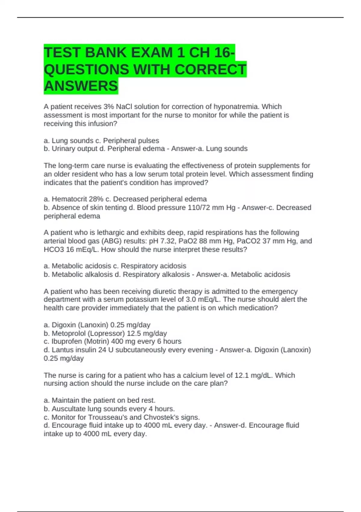 d. Place the patient on telemetry to monitor for peaked T waves.. - Answer-b. Assign