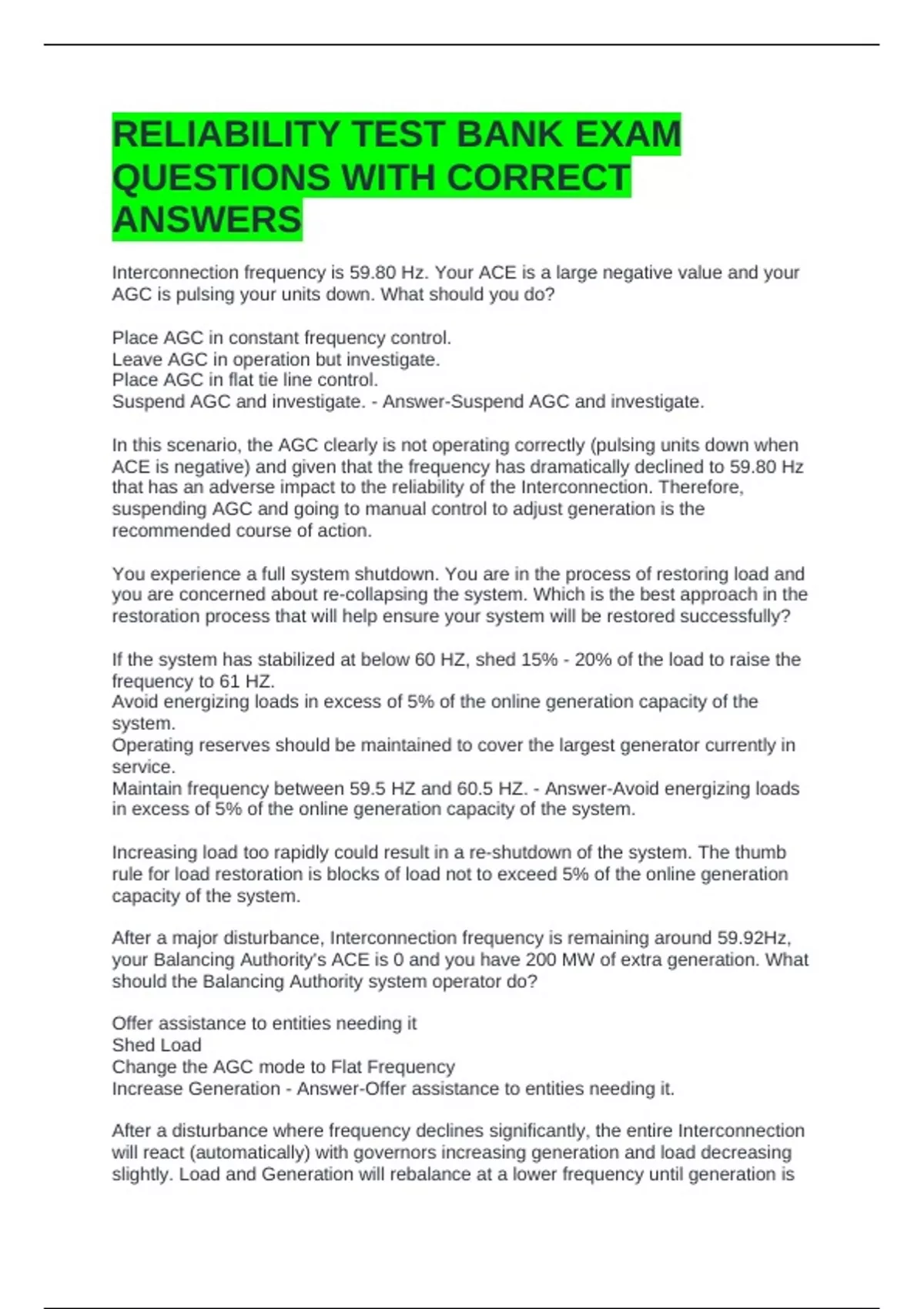 RELIABILITY TEST BANK EXAM QUESTIONS WITH CORRECT ANSWERS