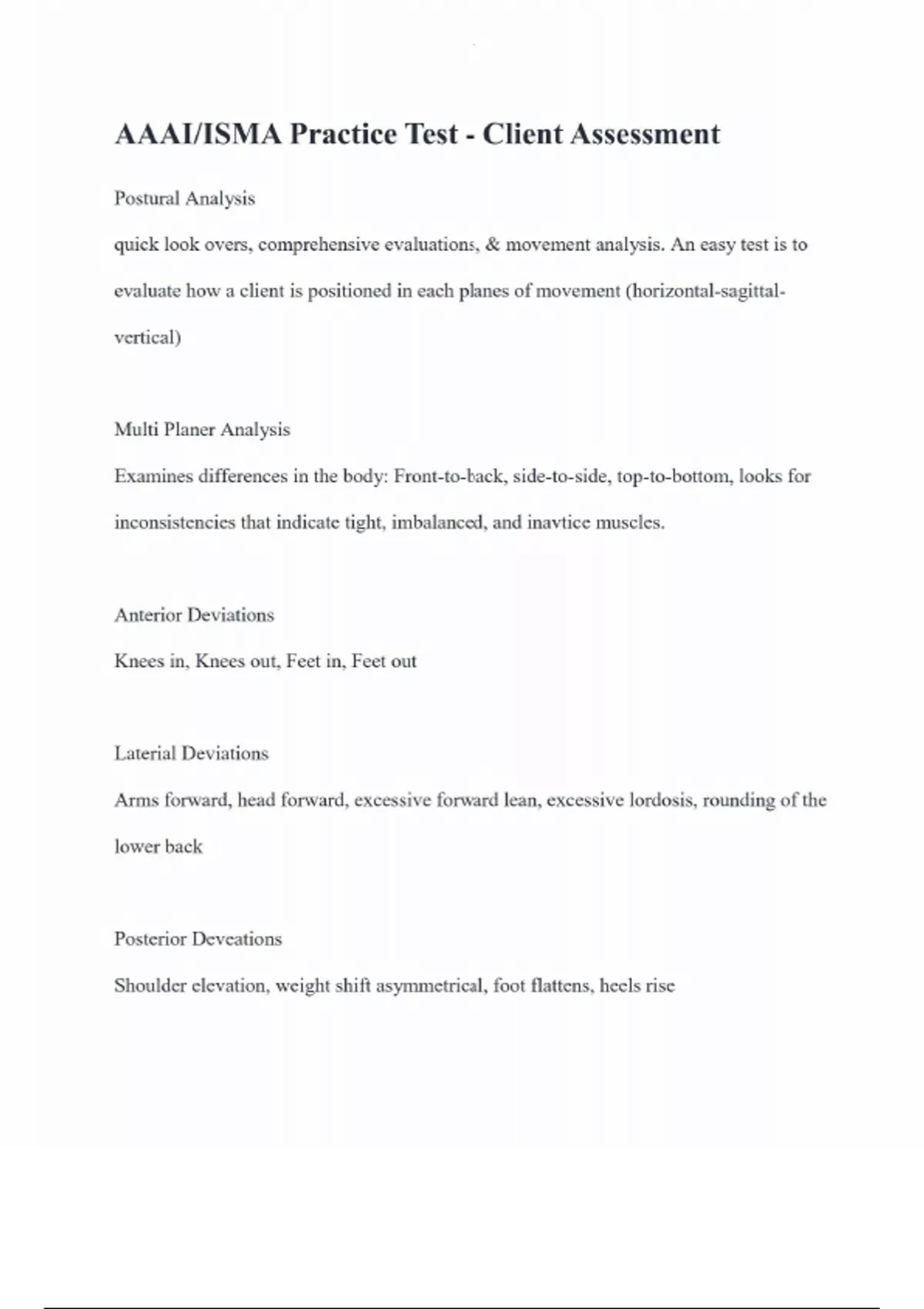 AAAI/ISMA Practice Test - Client Assessment Postural Analysis quick look overs, comprehensive evaluations, & movement analysis. An easy test is to evaluate how a client is positioned in each planes of movement (horizontal-sagittalvertical) Multi Planer Analysis Examines differences in the body: Front-to-back, side-to-side, top-to-bottom, looks for inconsistencies that indicate tight, imbalanced, and inavtice muscles. Anterior Deviations Knees in, Knees out, Feet in, Feet out Laterial Deviations Arms forward, head forward, excessive forward lean, excessive lordosis, rounding of the lower back