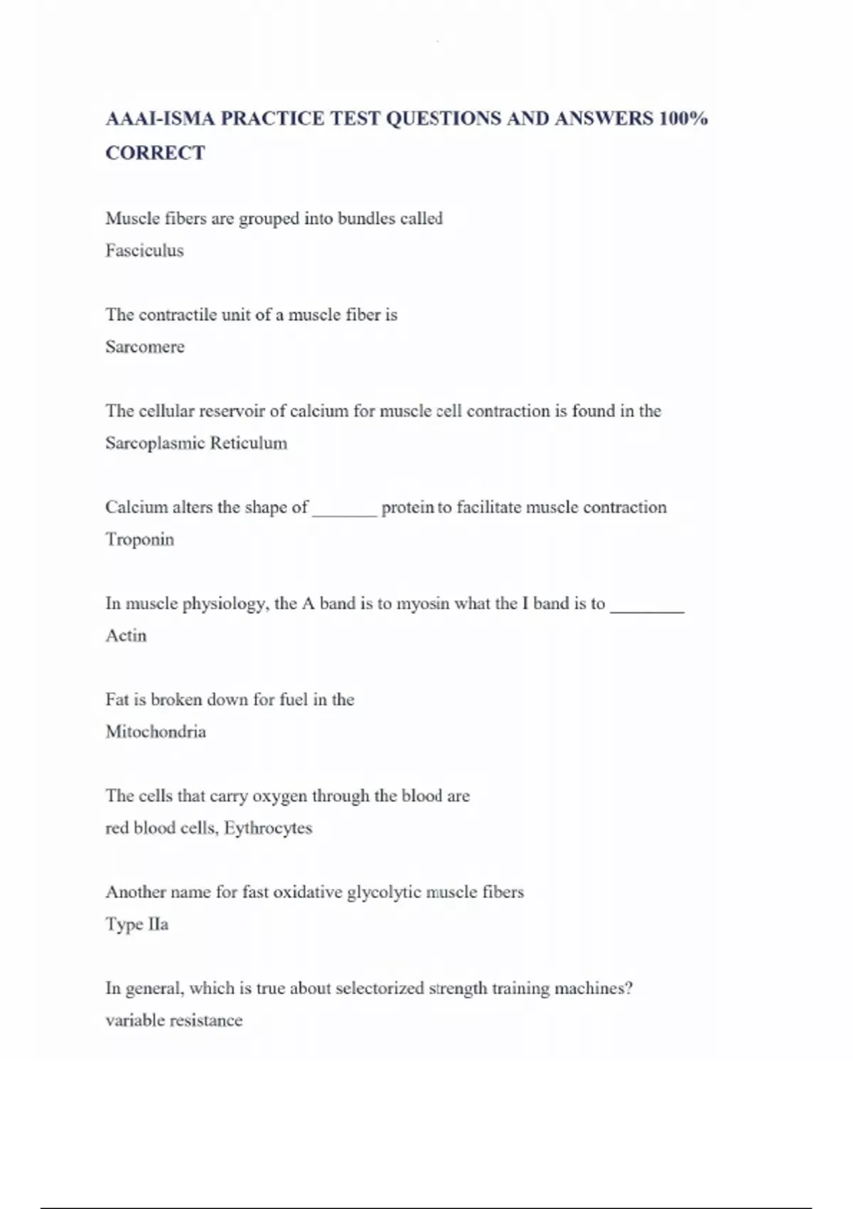 AAAI-ISMA PRACTICE TEST QUESTIONS AND ANSWERS 100% CORRECT Muscle fibers are grouped into bundles called Fasciculus The contractile unit of a muscle fiber is Sarcomere The cellular reservoir of calcium for muscle cell contraction is found in the Sarcoplasmic Reticulum Calcium alters the shape of _______ protein to facilitate muscle contraction Troponin In muscle physiology, the A band is to myosin what the I band is to ________ Actin Fat is broken down for fuel in the Mitochondria The cells that carry oxygen through the blood are red blood cells, Eythrocytes