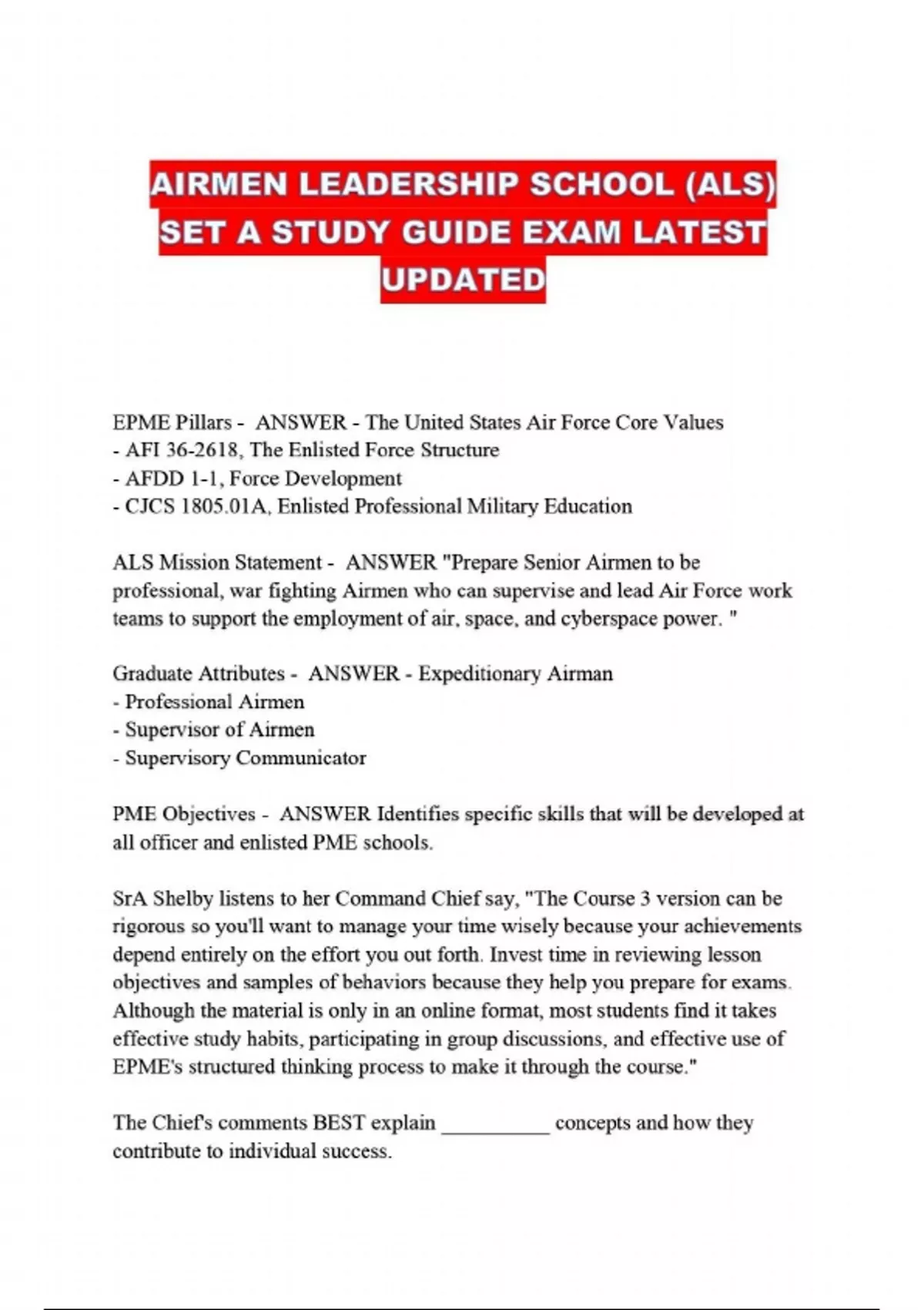 AIRMEN LEADERSHIP SCHOOL (ALS) SET A STUDY GUIDE EXAM LATEST UPDATED....