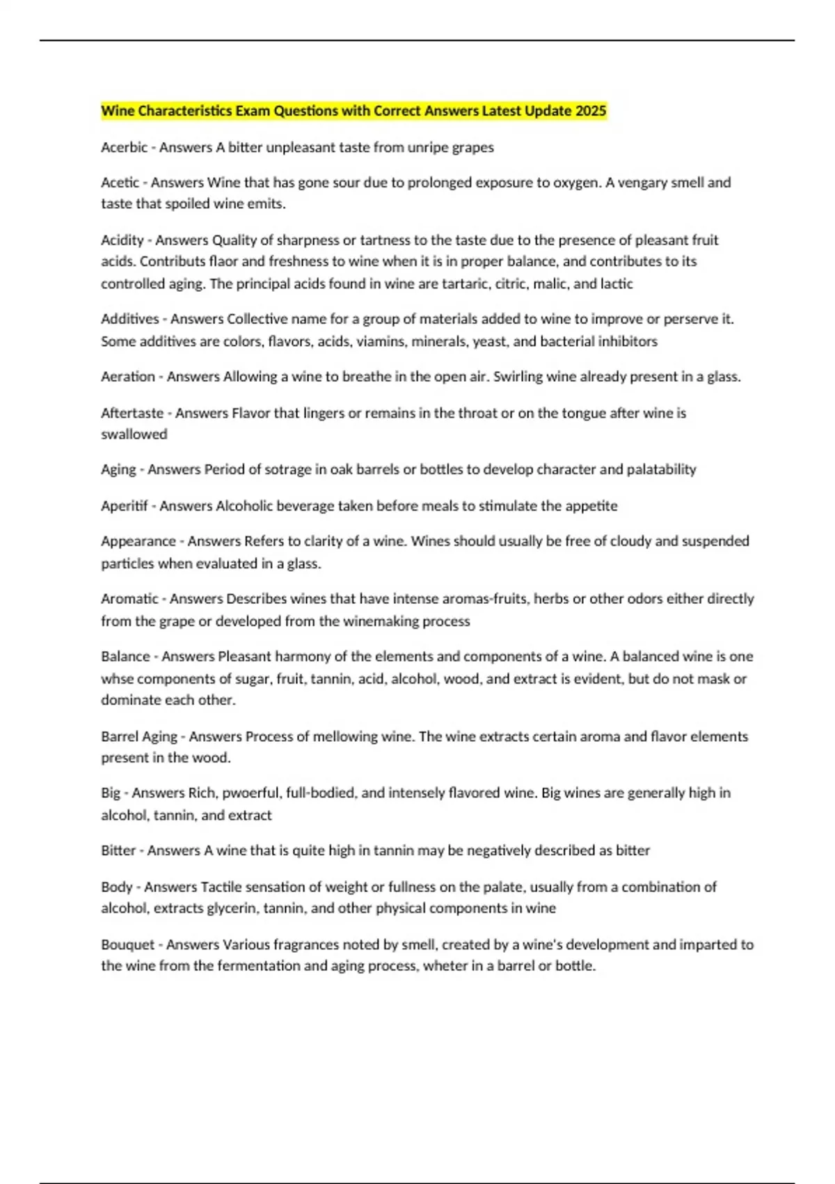 Acidity - Answers Quality of sharpness or tartness to the taste due to the presence of pleasant fruit