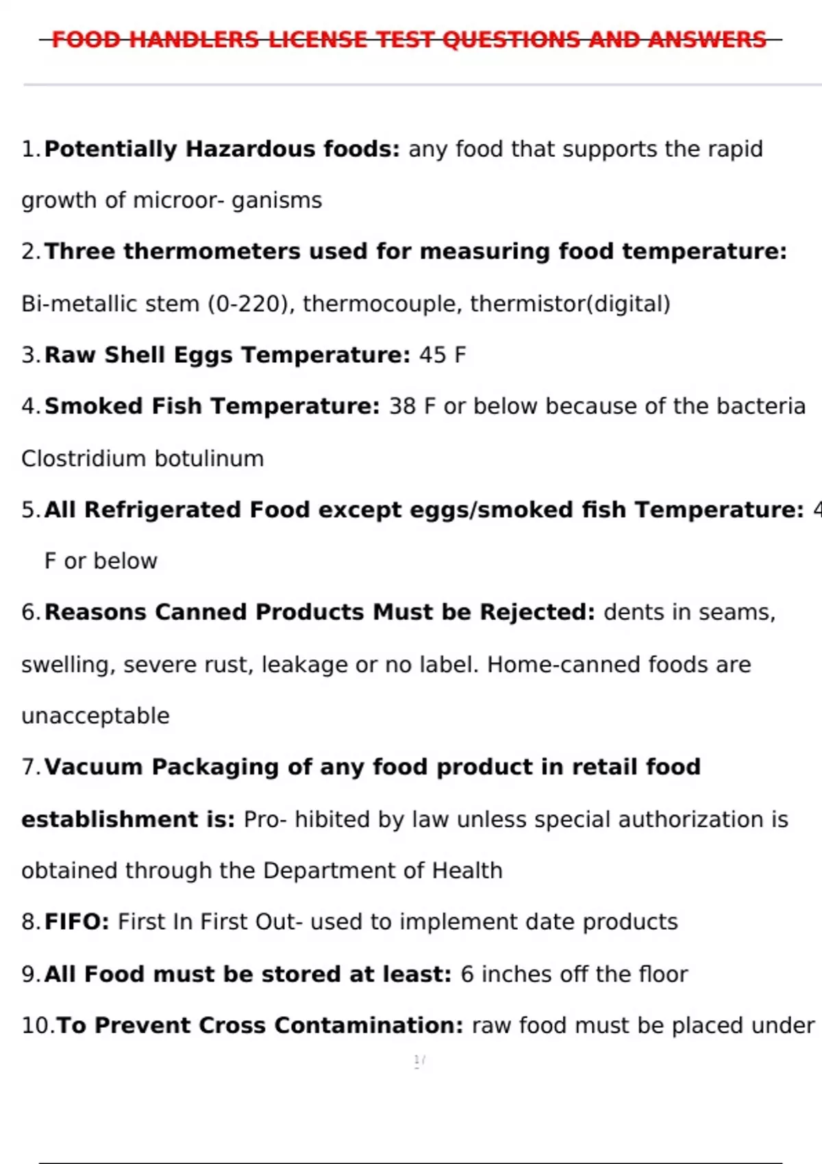 , FOOD HANDLERS LICENSE TEST QUESTIONS AND ANSWERS