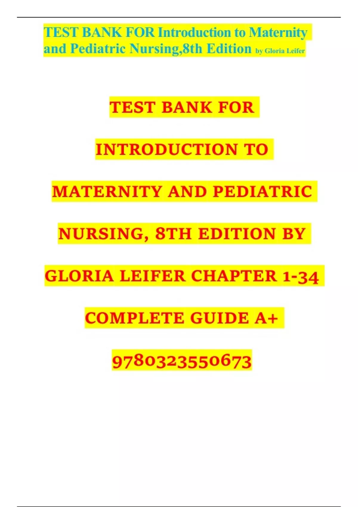 Test bank for Introduction to maternity and pediatric nursing 8th edition by gloria leifer chapter 1 34 complete guide a 9780323550673