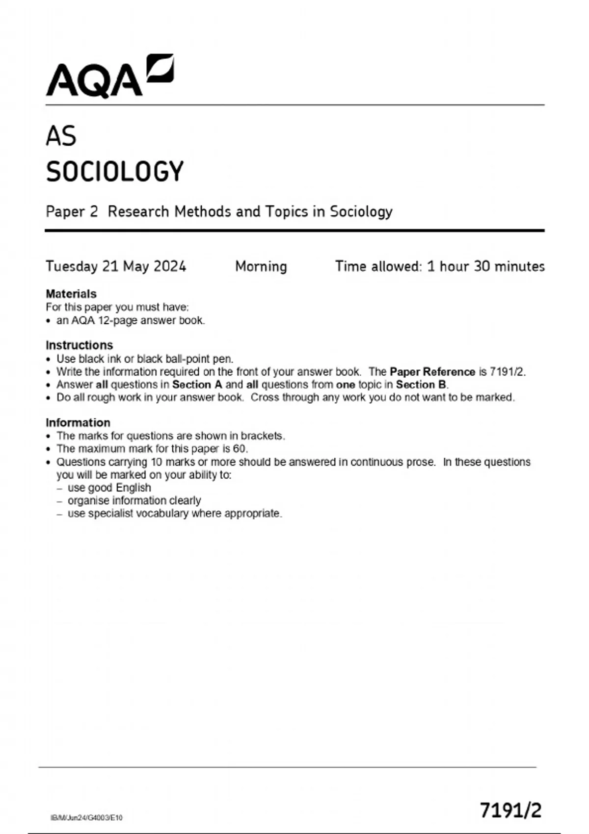 2024 AS SOCIOLOGY Paper 2 Research Methods and Topics in Sociology QUESTION PAPER WITH FINAL MARKING SCHEME 100% VERIFIED
