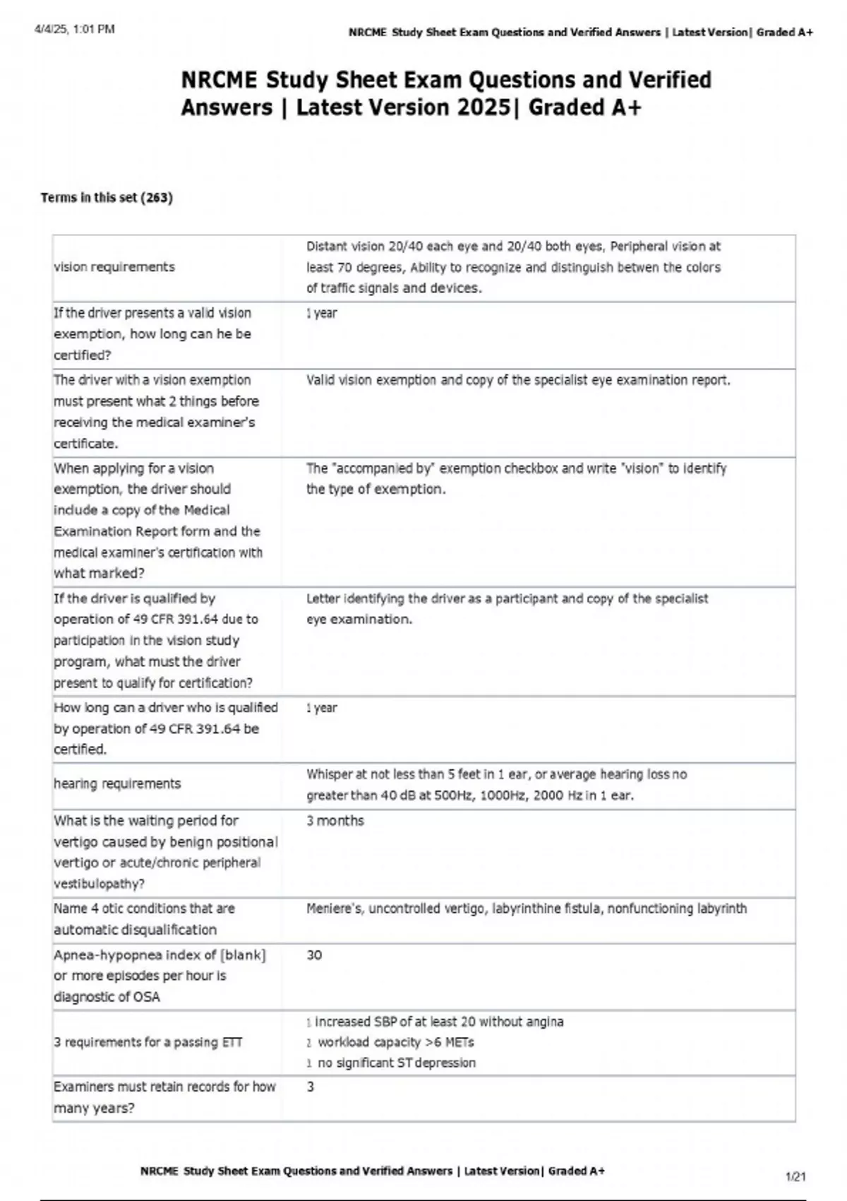 NRCME Study Sheet Exam Questions and Verified Answers | Latest Version 2025| Graded A+ | Just Released Terms in this set (263) vision requirements Distant vision 20/40 each eye and 20/40 both eyes, Peripheral vision at least 70 degrees, Ability to recognize and distinguish betwen the colors of traffic signals and devices. If the driver presents a valid vision exemption, how long can he be certified? 1 year The driver with a vision exemption must present what 2 things before receiving the medical examiner's certificate. Valid vision exemption and copy of the specialist eye examination report. When applying for a vision exemption, the driver should include a copy of the Medical Examination Report form and the medical examiner's certification with what marked? The "accompanied by" exemption checkbox and write "vision" to identify the type of exemption. If the driver is qualified by operation of 49 CFR 391.64 due to participation in the vision study program, what must the driver present to qualify for certification? Letter identifying the driver as a participant and copy of the specialist eye examination.