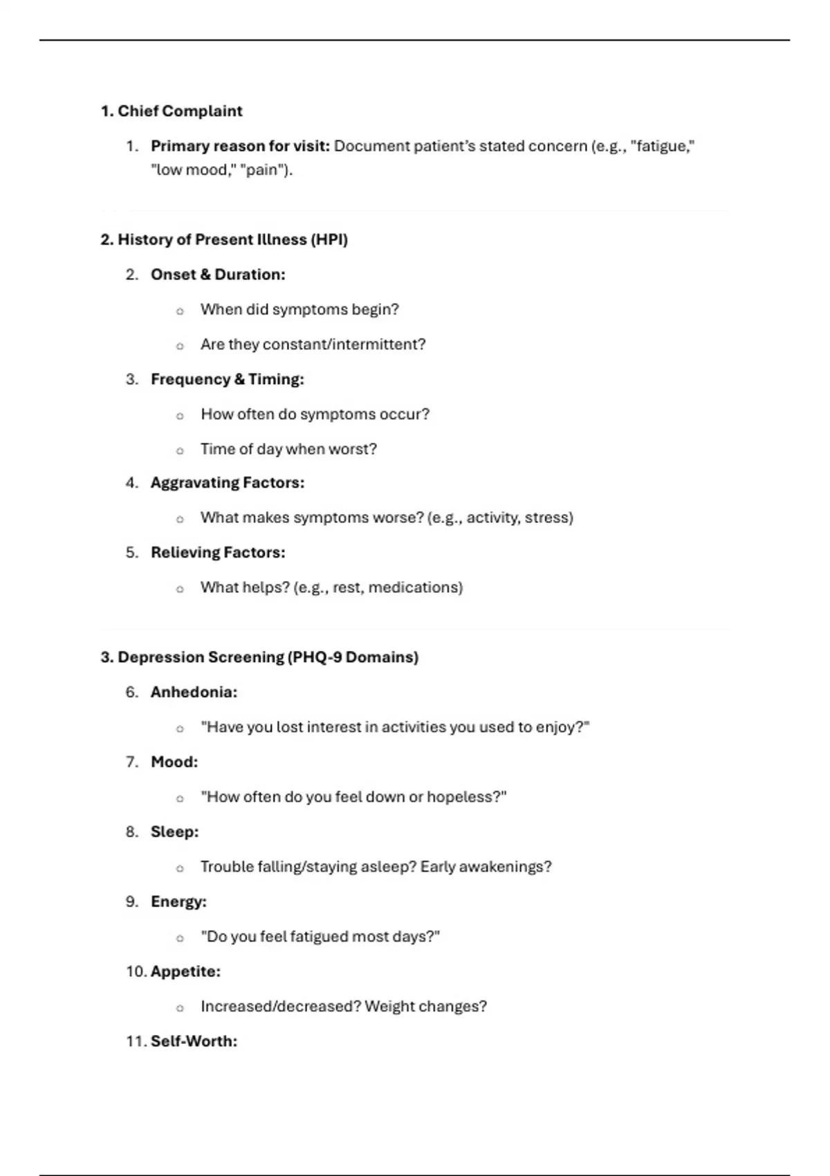 1. Primary reason for visit: Document patient’s stated concern (e.g., "fatigue,"