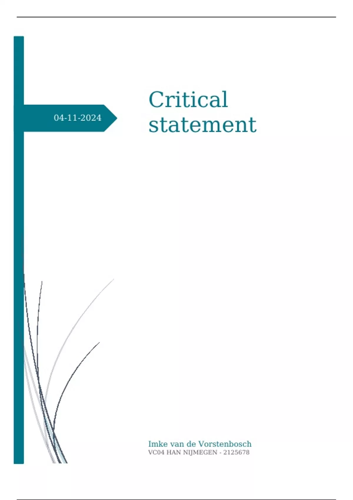 Het critical statement van mijn 2e jaars stage. verpleegkunde student. Ik heb een 10 gehaald voor mijn stage.