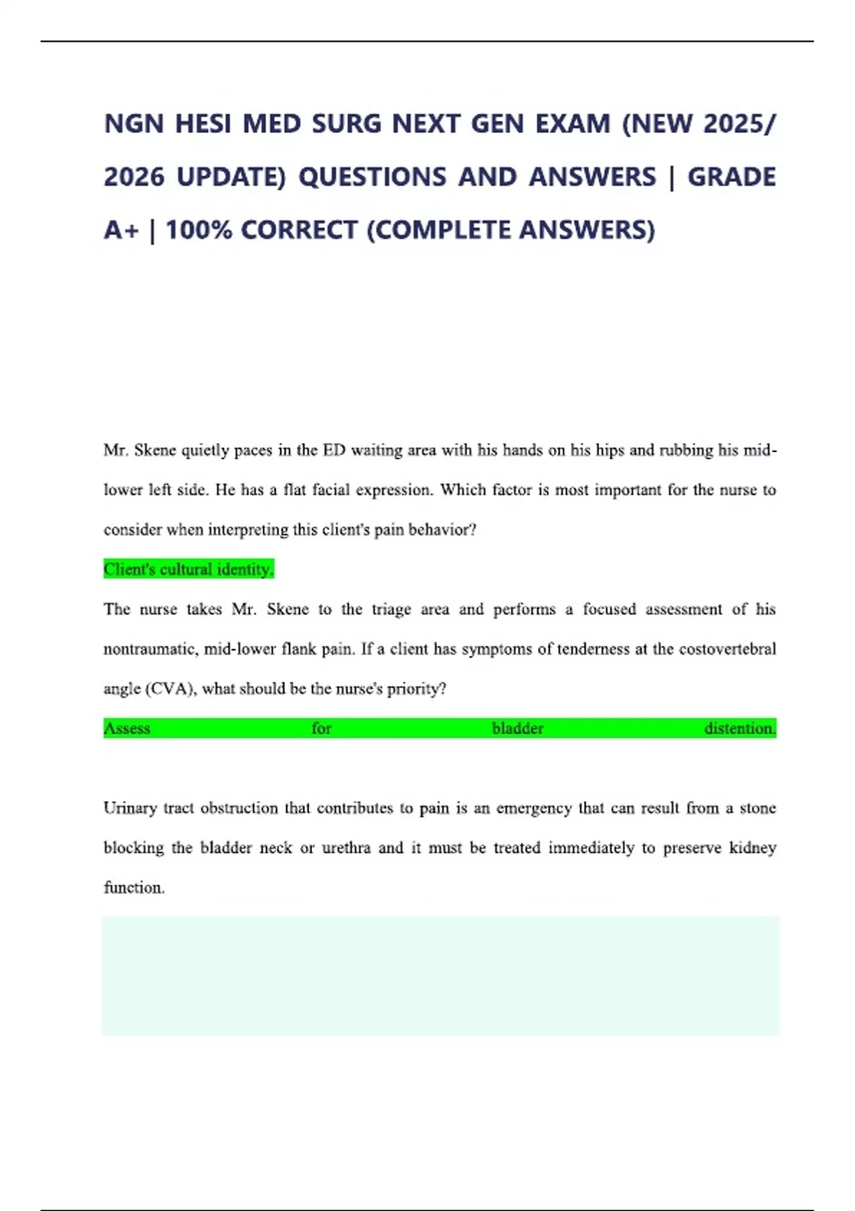 NGN HESI MED SURG NEXT GEN EXAM (NEW 2025/ 2026 UPDATE) QUESTIONS AND ANSWERS | GRADE A+ | 100% CORRECT (COMPLETE ANSWERS) Mr. Skene quietly paces in the ED waiting area with his hands on his hips and rubbing his midlower left side. He has a flat facial expression. Which factor is most important for the nurse to consider when interpreting this client's pain behavior? Client's cultural identity. The nurse takes Mr. Skene to the triage area and performs a focused assessment of his nontraumatic, mid-lower flank pain. If a client has symptoms of tenderness at the costovertebral angle (CVA), what should be the nurse's priority? Assess for bladder distention. Urinary tract obstruction that contributes to pain is an emergency that can result from a stone blocking the bladder neck or urethra and it must be treated immediately to preserve kidney function. The triage nurse continues to assess Mr. Skene's pain. Which elements should be included in the pain assessment? (Select all that apply