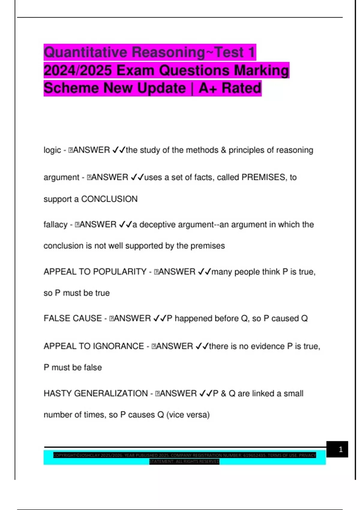 Quantitative Reasoning~Test 1 2024/2025 Exam Questions Marking Scheme New Update | A+ Rated logic -