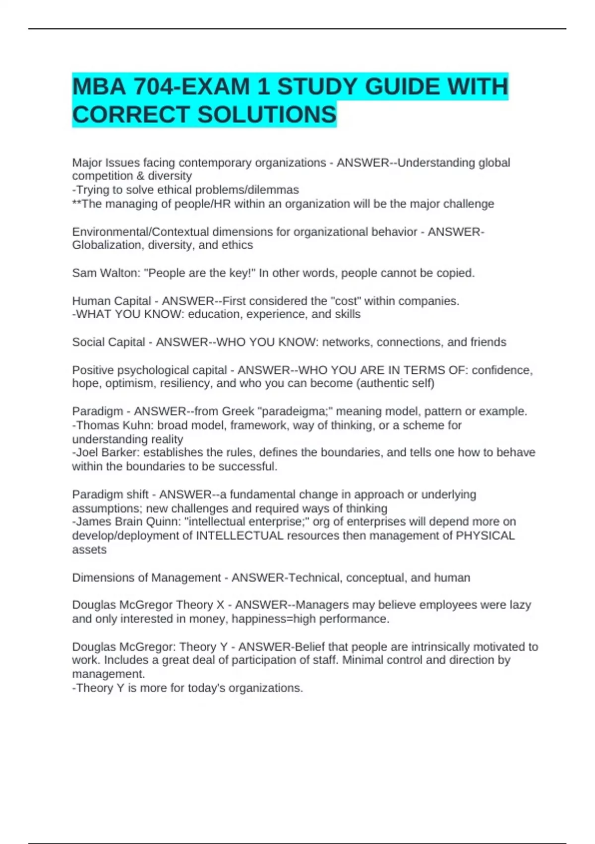 MBA 704-EXAM 1 STUDY GUIDE WITH CORRECT SOLUTIONSMBA 704-EXAM 1 STUDY GUIDE WITH CORRECT SOLUTIONSMajor Issues facing contemporary organizations - ANSWER--Understanding global competition & diversity -Trying to solve ethical problems/dilemmas **The managing of people/HR within an organization will be the major challenge Environmental/Contextual dimensions for organizational behavior - ANSWER-Globalization, diversity, and ethics Sam Walton: "People are the key!" In other words, people cannot be copied. Human Capital - ANSWER--First considered the "cost" within companies. -WHAT YOU KNOW: education, experience, and skills