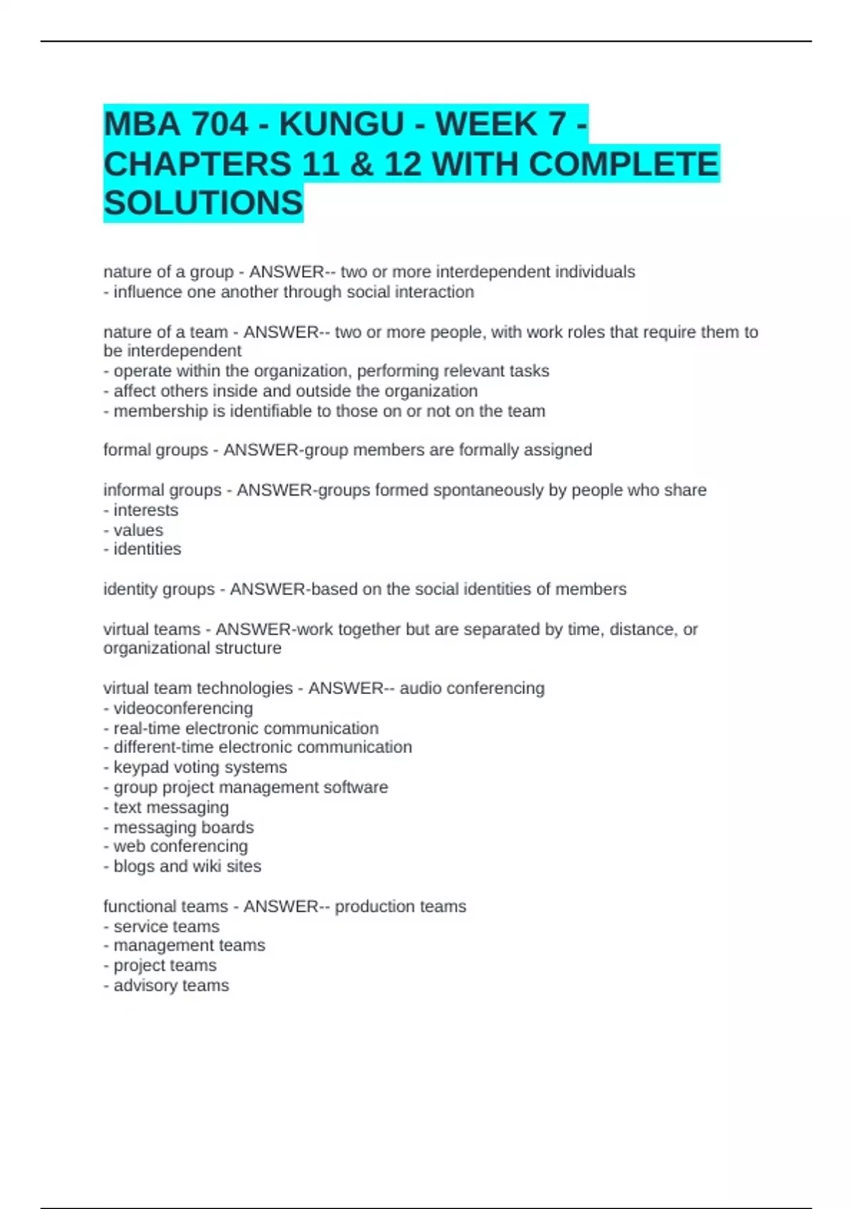 MBA 704 - KUNGU - WEEK 7 - CHAPTERS 11 & 12 WITH COMPLETE SOLUTIONSMBA 704 - KUNGU - WEEK 7 - CHAPTERS 11 & 12 WITH COMPLETE SOLUTIONSMBA 704 - KUNGU - WEEK 7 - CHAPTERS 11 & 12 WITH COMPLETE SOLUTIONS nature of a group - ANSWER-- two or more interdependent individuals - influence one another through social interaction nature of a team - ANSWER-- two or more people, with work roles that require them to be interdependent - operate within the organization, performing relevant tasks - affect others inside and outside the organization - membership is identifiable to those on or not on the team formal groups - ANSWER-group members are formally assigned