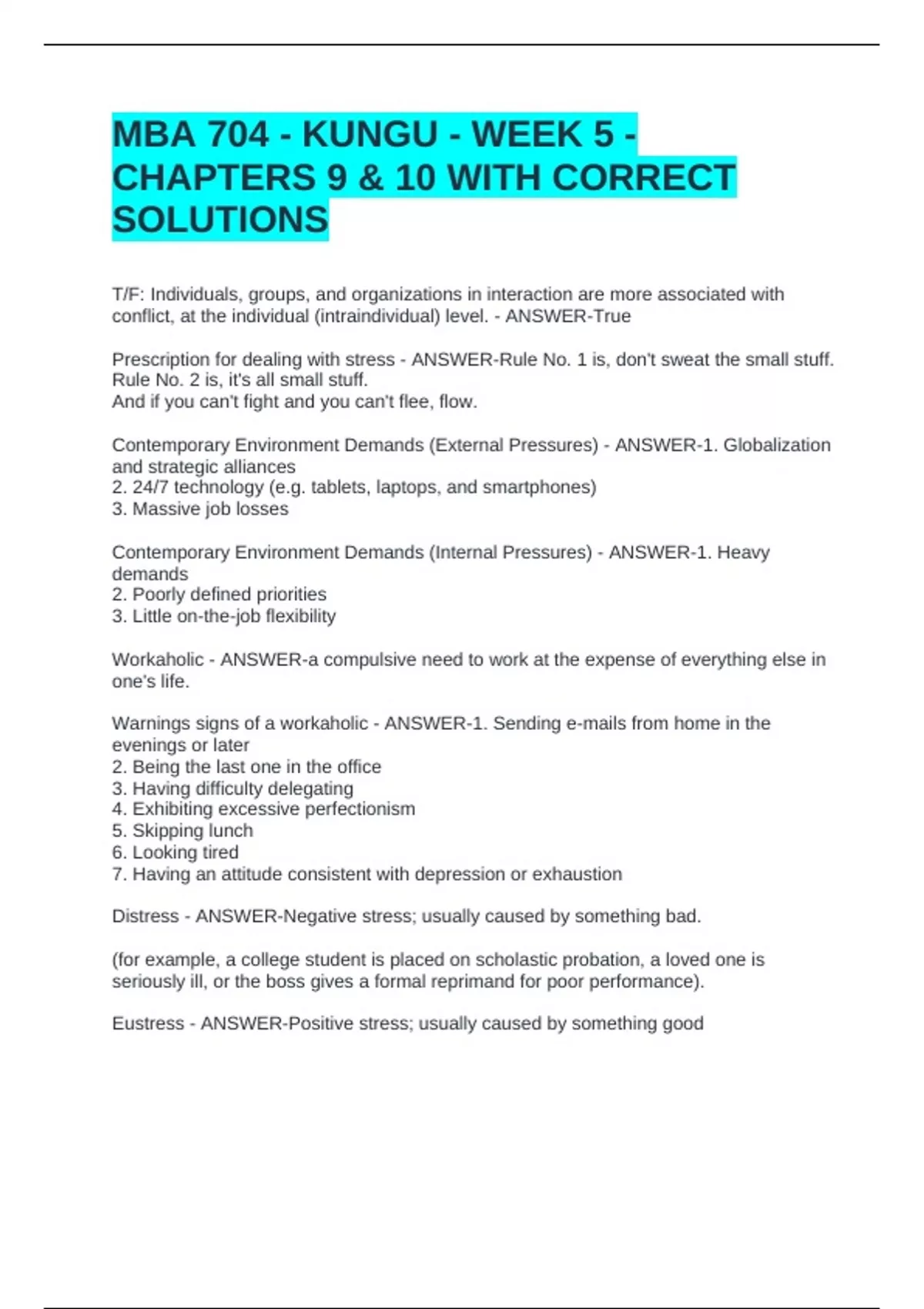 MBA 704 - KUNGU - WEEK 5 - CHAPTERS 9 & 10 WITH CORRECT SOLUTIONSMBA 704 - KUNGU - WEEK 5 - CHAPTERS 9 & 10 WITH CORRECT SOLUTIONSMBA 704 - KUNGU - WEEK 5 - CHAPTERS 9 & 10 WITH CORRECT SOLUTIONS T/F: Individuals, groups, and organizations in interaction are more associated with conflict, at the individual (intraindividual) level. - ANSWER-True Prescription for dealing with stress - ANSWER-Rule No. 1 is, don't sweat the small stuff. Rule No. 2 is, it's all small stuff. And if you can't fight and you can't flee, flow. Contemporary Environment Demands (External Pressures) - ANSWER-1. Globalization and strategic alliances 2. 24/7 technology (e.g. tablets, laptops, and smartphones) 3. Massive job losses Contemporary Environment Demands (Internal Pressures) - ANSWER-1. Heavy demands 2. Poorly defined priorities 3. Little on-the-job flexibility