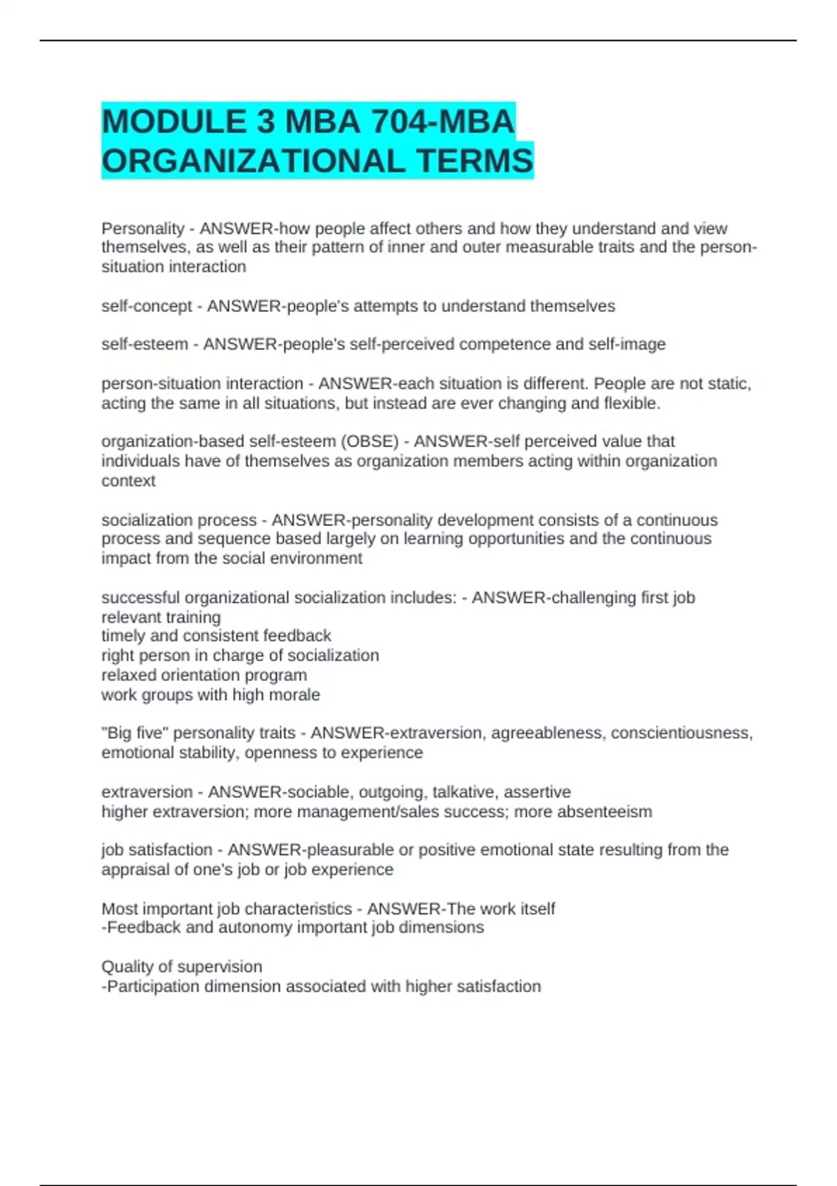 MODULE 3 MBA 704-MBA ORGANIZATIONAL TERMSMODULE 3 MBA 704-MBA ORGANIZATIONAL TERMSMODULE 3 MBA 704-MBA ORGANIZATIONAL TERMSMODULE 3 MBA 704-MBA ORGANIZATIONAL TERMSPersonality - ANSWER-how people affect others and how they understand and view themselves, as well as their pattern of inner and outer measurable traits and the person-situation interaction self-concept - ANSWER-people's attempts to understand themselves self-esteem - ANSWER-people's self-perceived competence and self-image person-situation interaction - ANSWER-each situation is different. People are not static, acting the same in all situations, but instead are ever changing and flexible. organization-based self-esteem (OBSE) - ANSWER-self perceived value that individuals have of themselves as organization members acting within organization
