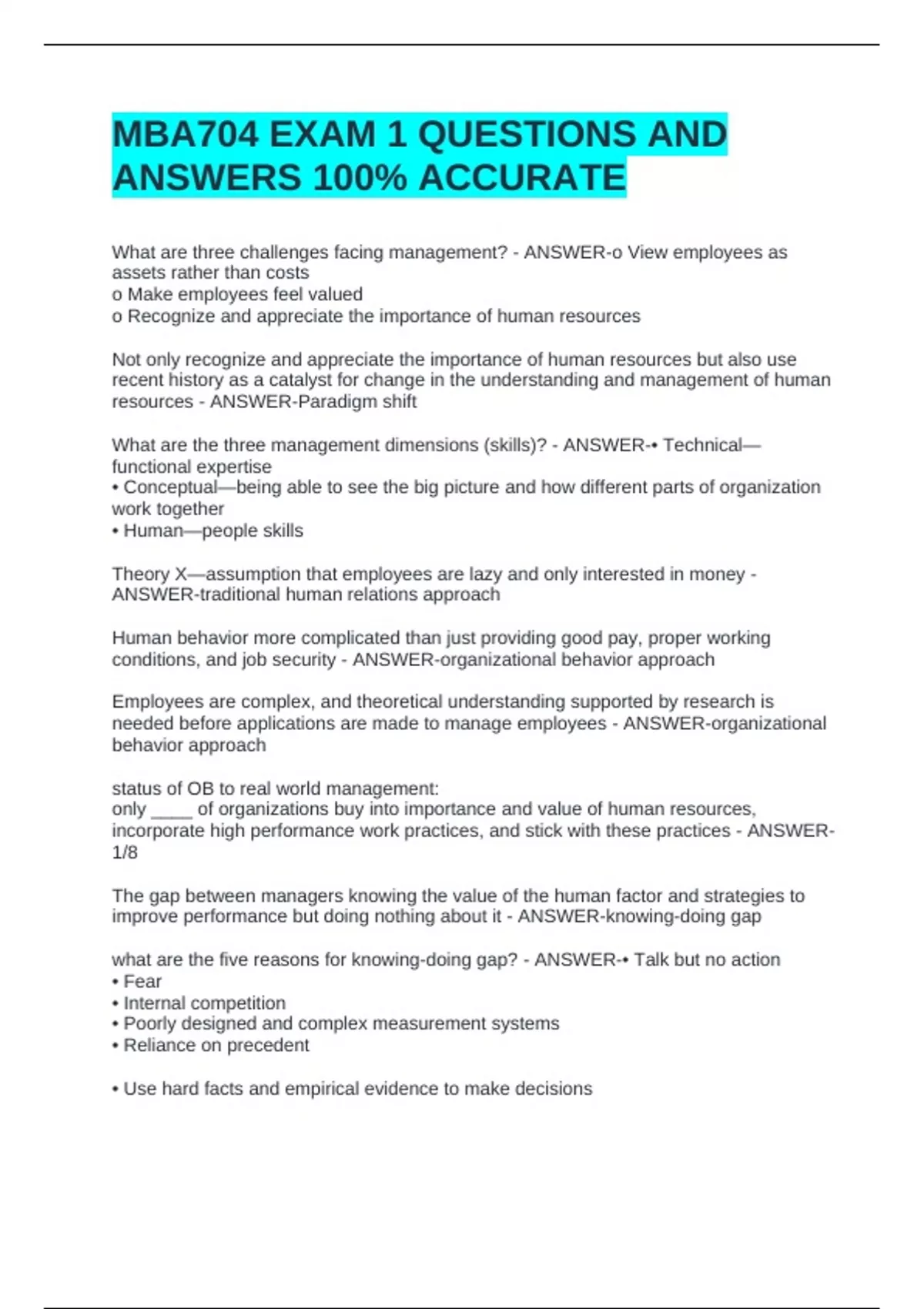 MBA704 EXAM 1 QUESTIONS AND ANSWERS 100% ACCURATEMBA704 EXAM 1 QUESTIONS AND ANSWERS 100% ACCURATEMBA704 EXAM 1 QUESTIONS AND ANSWERS 100% ACCURATE What are three challenges facing management? - ANSWER-o View employees as assets rather than costs o Make employees feel valued o Recognize and appreciate the importance of human resources Not only recognize and appreciate the importance of human resources but also use recent history as a catalyst for change in the understanding and management of human resources - ANSWER-Paradigm shift What are the three management dimensions (skills)? - ANSWER-• Technical—functional expertise • Conceptual—being able to see the big picture and how different parts of organization work together • Human—people skills Theory X—assumption that employees are lazy and only interested in money - ANSWER-traditional human relations approach