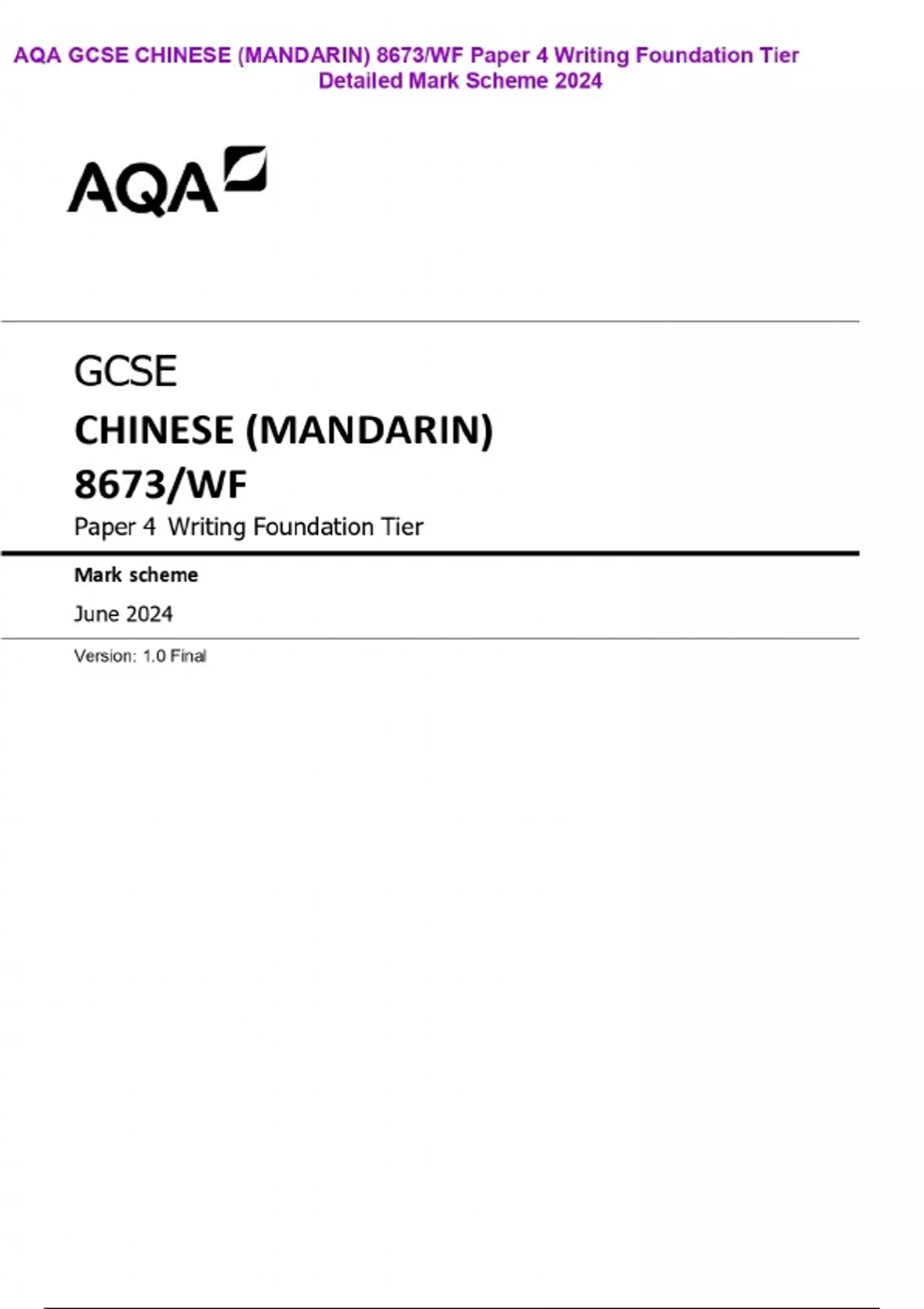 AQA GCSE CHINESE (MANDARIN) 8673/WF Paper 4 Writing Foundation Tier Detailed Mark Scheme 2024