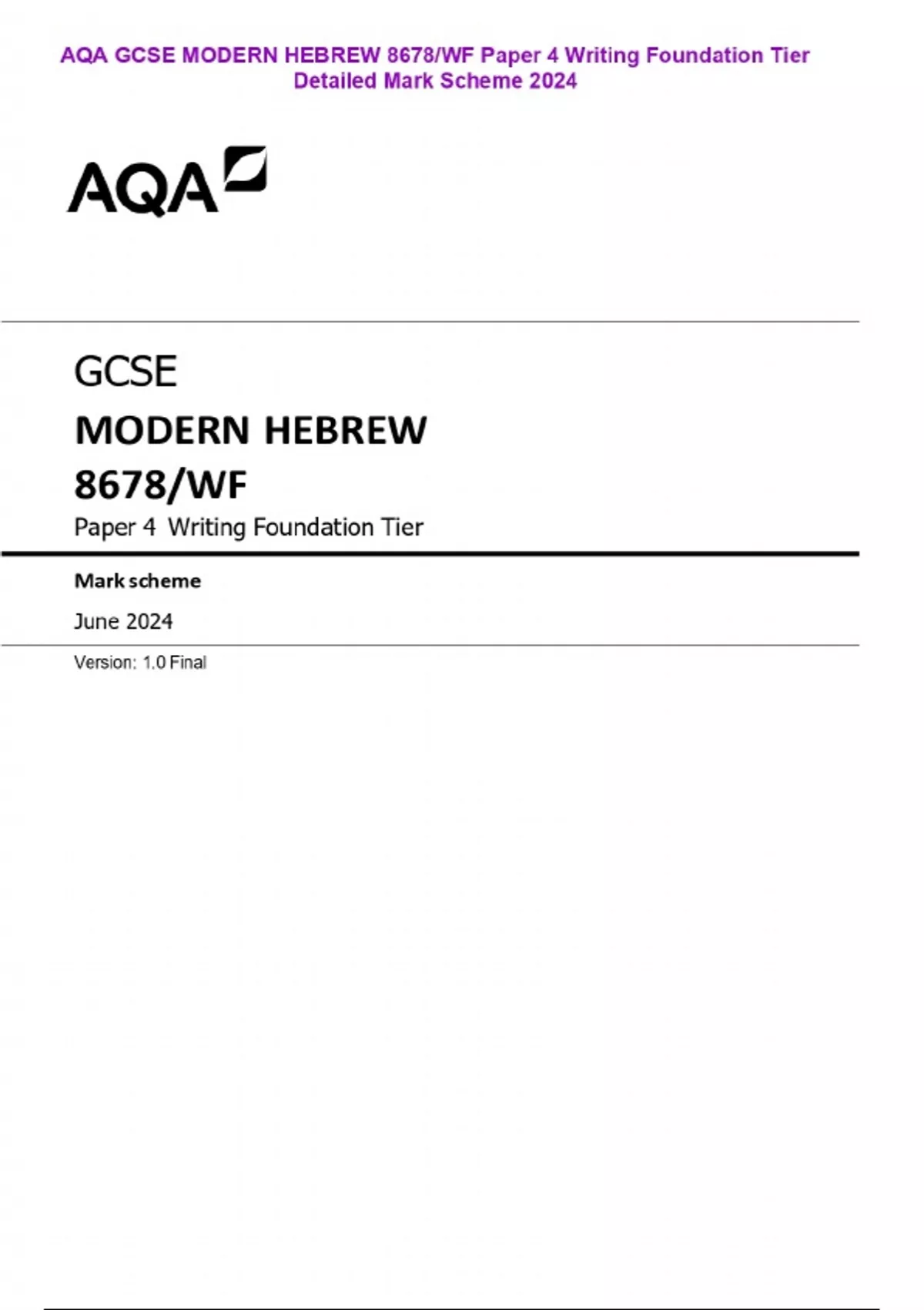AQA GCSE MODERN HEBREW 8678/WF Paper 4 Writing Foundation Tier Detailed Mark Scheme 2024