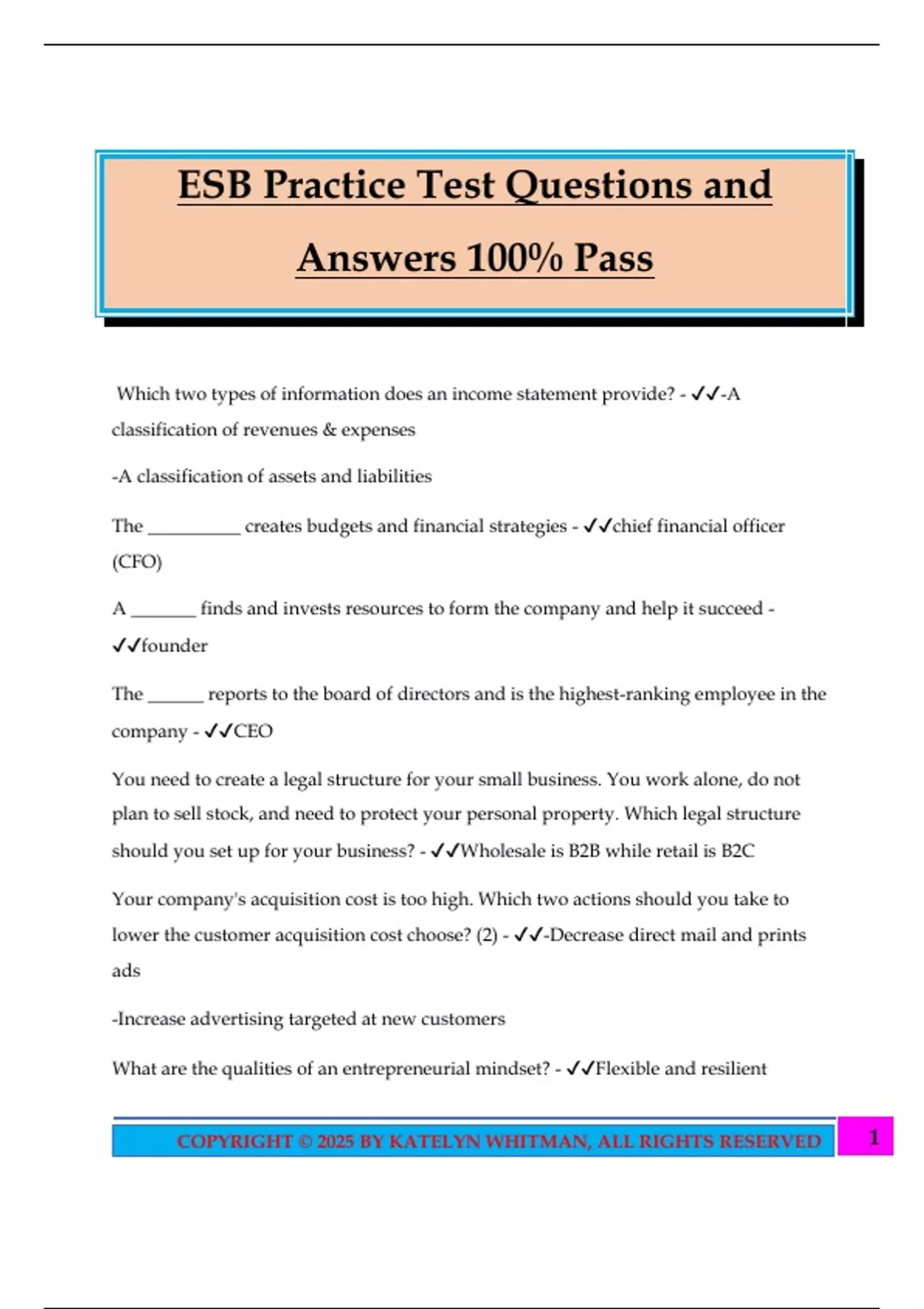 ESB Practice Test Questions and Answers 100% Pass Which two types of information does an income statement provide? - -A classification of revenues & expenses -A classification of assets and liabilities The __________ creates budgets and financial strategies - chief financial officer (CFO) A _______ finds and invests resources to form the company and help it succeed - founder The ______ reports to the board of directors and is the highest-ranking employee in the company - CEO You need to create a legal structure for your small business. You work alone, do not plan to sell stock, and need to protect your personal property. Which legal structure should you set up for your business? - Wholesale is B2B while retail is B2C Your company's acquisition cost is too high. Which two actions should you take to lower the customer acquisition cost choose? (2) - -Decrease direct mail and prints ads -Increase advertising targeted at new customers What are the qualities of an entrepreneurial mindset? - Flexible and resilient 2COPYRIGHT © 2025 BY KATELYN WHITMAN, ALL RIGHTS RESERVED You manufacture racecars. How should you determine performance criteria for your product? - Test an interactive prototype Which three roles have equity in a business? (Choose 3) - -Partner -Owner -Stockholder You decide to create a new type of energy bar. You take some samples to a focus group to get their reactions to your product. Which stage of the development process are you in? - Market strategy creation Statements about the product/market fit analysis (t/f) a.Product/market fit results in low volume sales b.Repeated use of a product is an indicator of product/market fit c.A value hypothesis explains why a customer would use a product d.Product/market fit occurs when you build something that people want - a. False b. False c. True d. True You have a landscaping business. You have the following financ
