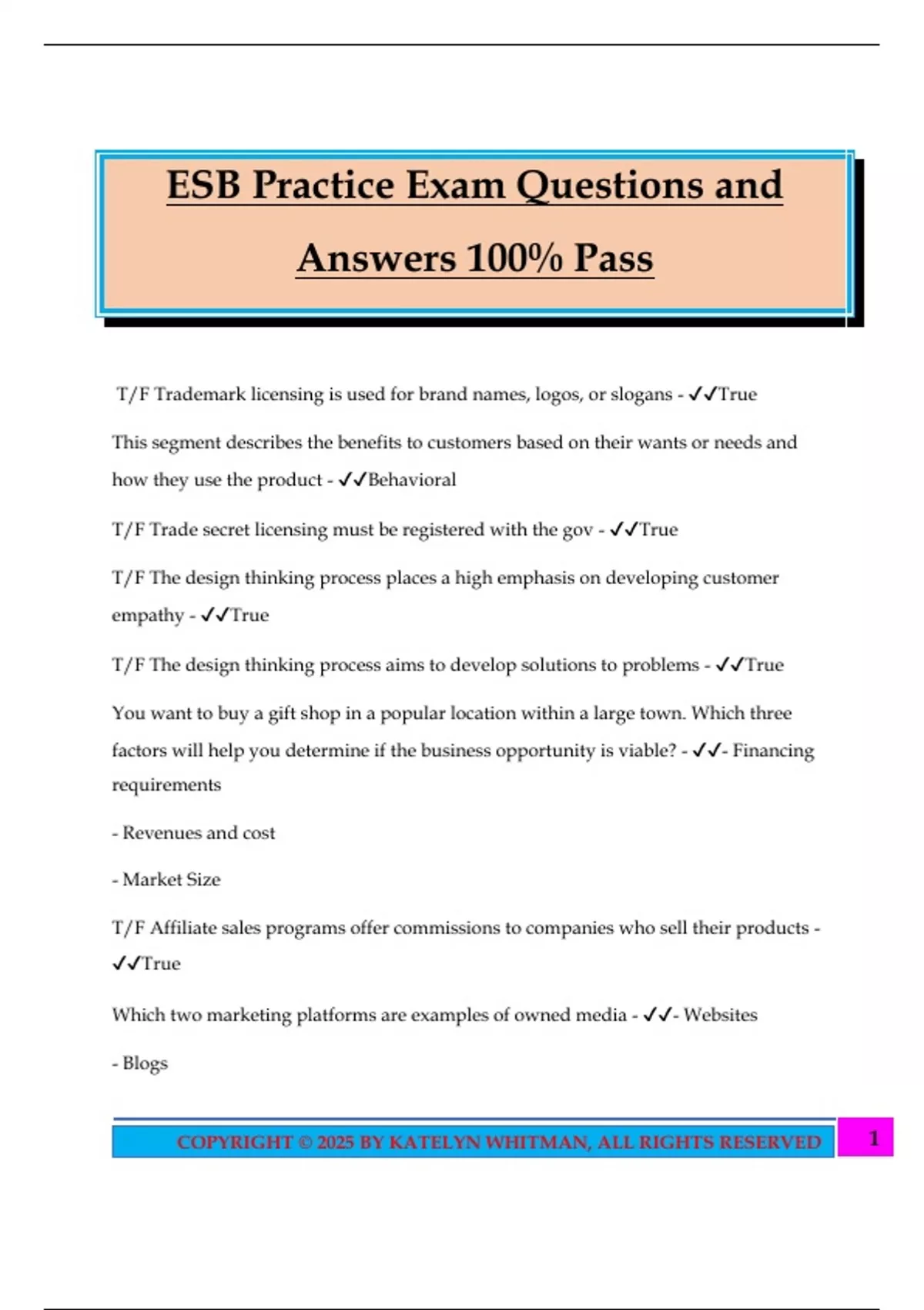 ESB Practice Exam Questions and Answers 100% Pass T/F Trademark licensing is used for brand names, logos, or slogans - True This segment describes the benefits to customers based on their wants or needs and how they use the product - Behavioral T/F Trade secret licensing must be registered with the gov - True T/F The design thinking process places a high emphasis on developing customer empathy - True T/F The design thinking process aims to develop solutions to problems - True You want to buy a gift shop in a popular location within a large town. Which three factors will help you determine if the business opportunity is viable? - - Financing requirements - Revenues and cost - Market Size T/F Affiliate sales programs offer commissions to companies who sell their products - True Which two marketing platforms are examples of owned media - - Websites - Blogs 2COPYRIGHT © 2025 BY KATELYN WHITMAN, ALL RIGHTS RESERVED What does a CFO (chief financial officer) do? - Creates budgets and financial strategies (CEO- chief executive officer, CIO-chief information officer, COO- chief operating officer) Which two services does direct distribution provide that fulfilment centers do not - - Product marketing - Product manufacturing T/F The design thinking process aims to develop a product based on the designer's needs - False T/F Fixed cost are expenses that have to be paid by the company, regardless of changes in revenue - True T/F An S corp, is suitable for internal companies with at least 100 shareholders - Flase T/F Variable cost depend on the increase or decrease in the amount or services a product has sold - True T/F Value engineering changes the purpose of the product - False What is the fist step in forming a product/ market fit hypo
