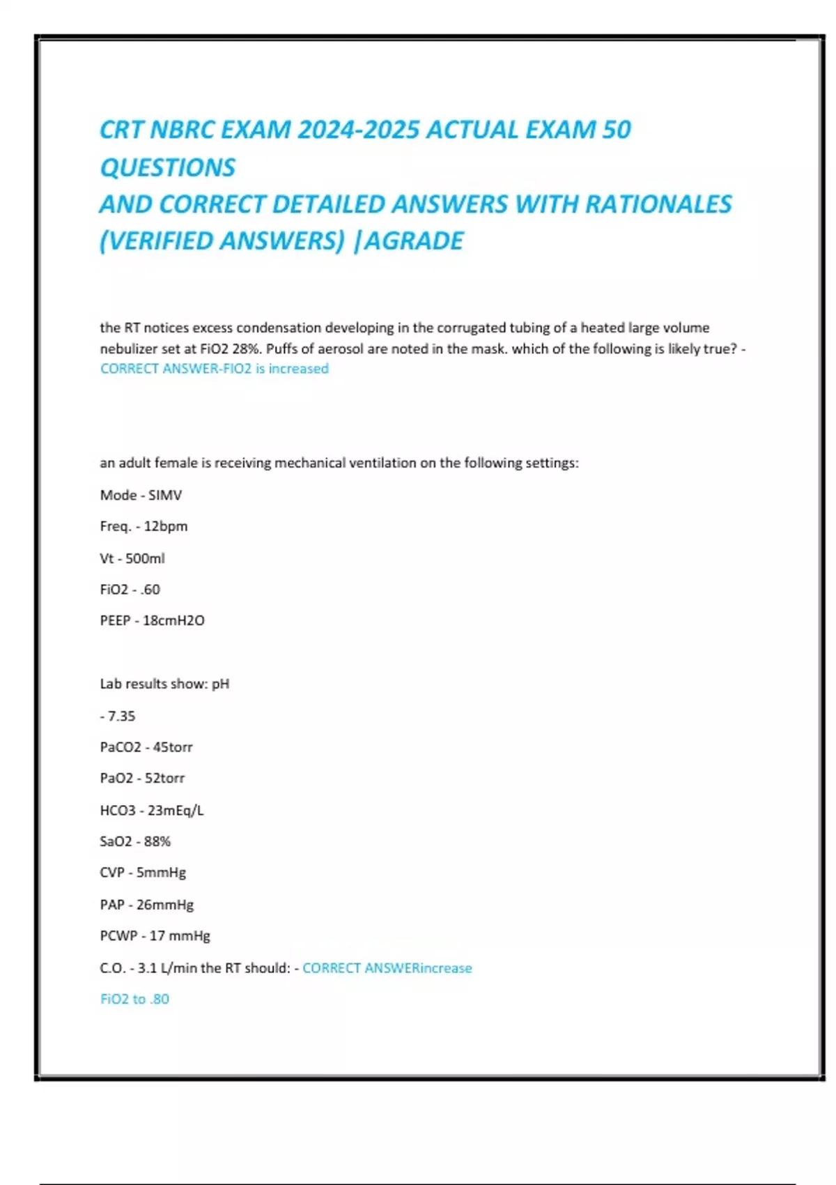 CRT NBRC EXAM ACTUAL EXAM 50 QUESTIONS AND CORRECT DETAILED ANSWERS WITH RATIONALES (VERIFIED ANSWERS) |AGRADE the RT notices excess condensation developing in the corrugated tubing of a heated large volume nebulizer set at FiO2 28%. Puffs of aerosol are noted in the mask. which of the following is likely true? - CORRECT ANSWER-FIO2 is increased an adult female is receiving mechanical ventilation on the following settings: Mode - SIMV Freq. - 12bpm Vt - 500ml FiO2 - .60 PEEP - 18cmH2O Lab results show: pH - 7.35 PaCO2 - 45torr PaO2 - 52torr HCO3 - 23mEq/L SaO2 - 88% CVP - 5mmHg PAP - 26mmHg PCWP - 17 mmHg C.O. - 3.1 L/min the RT should: - CORRECT ANSWERincrease FiO2 to .80 A RT is administering IPPB therapy with a mask. before the patient has completely exhaled, the machine begins the inspiratory phase. The therapist should adjust: - CORRECT ANSWER-sensitivity The RT responds to a high pressure alarm on a patient receiving volume control ventilation through a 7.0 mm or endotracheal tube. The patient appears agitated, is mildly thrashing about the bed, & is not responsive to verbal direction. The therapist should: - CORRECT ANSWER-perform endotracheal suctioning results of a pre & post bronchodilator spirometry are as follows: Pre. Post FVC 81 83 FEV1 61 76 FEF FEF which of the following best represents a correct interpretation of this data? - CORRECT ANSWERobstructive lung disease a patient is receiving volume controlled mechanical ventilation. which of the following is needed to calculate the physiological deadspace? - CORRECT ANSWER-capnograph (CO2) The diastolic portion of the pulmonary artery pressure differs from the mean pulmonary capillary wedge pressure by approximately how much? - CORRECT ANSWER-0-4torr A patient with COPD is receiving volume controlled mechanical ventilation with an I:E ratio of 1:2. Autopeep is developing. The RT should: - CORRECT ANSWER-increase the flow rate during a routine ventilator check the RT notices the following data on the ventilator flow sheet Time peak pressure 25 - 33 - 39 plateau pressure 12 - 12 - 12 - CORRECT ANSWER-pt requires suctioning