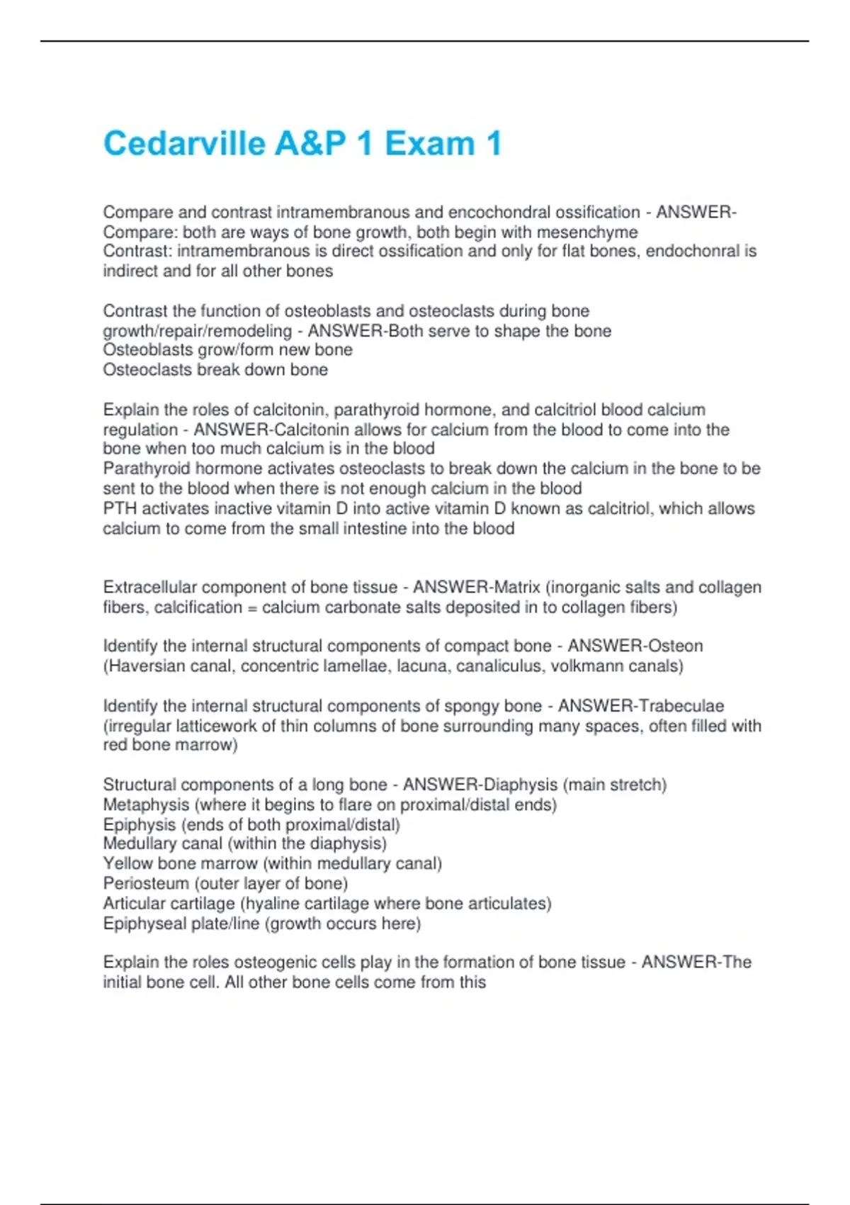 Compare and contrast intramembranous and encochondral ossification - ANSWERCompare: both are ways of bone growth, both begin with mesenchyme Contrast: intramembranous is direct ossification and only for flat bones, endochonral is indirect and for all other bones Contrast the function of osteoblasts and osteoclasts during bone growth/repair/remodeling - ANSWER-Both serve to shape the bone Osteoblasts grow/form new bone Osteoclasts break down bone Explain the roles of calcitonin, parathyroid hormone, and calcitriol blood calcium regulation - ANSWER-Calcitonin allows for calcium from the blood to come into the bone when too much calcium is in the blood Parathyroid hormone activates osteoclasts to break down the calcium in the bone to be sent to the blood when there is not enough calcium in the blood PTH activates inactive vitamin D into active vitamin D known as calcitriol, which allows calcium to come from the small intestine into the blood