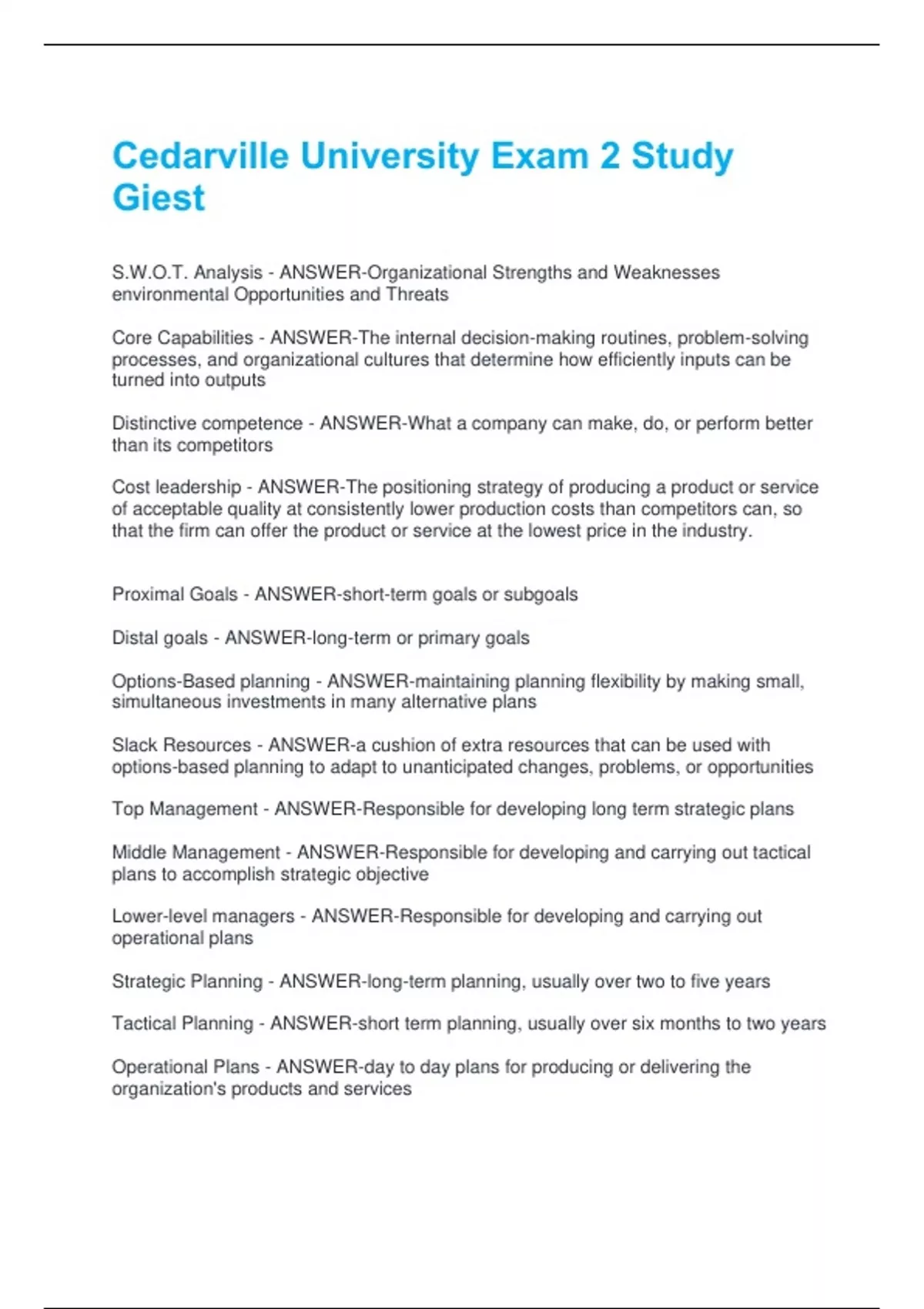 Top Management - ANSWER-Responsible for developing long term strategic plans