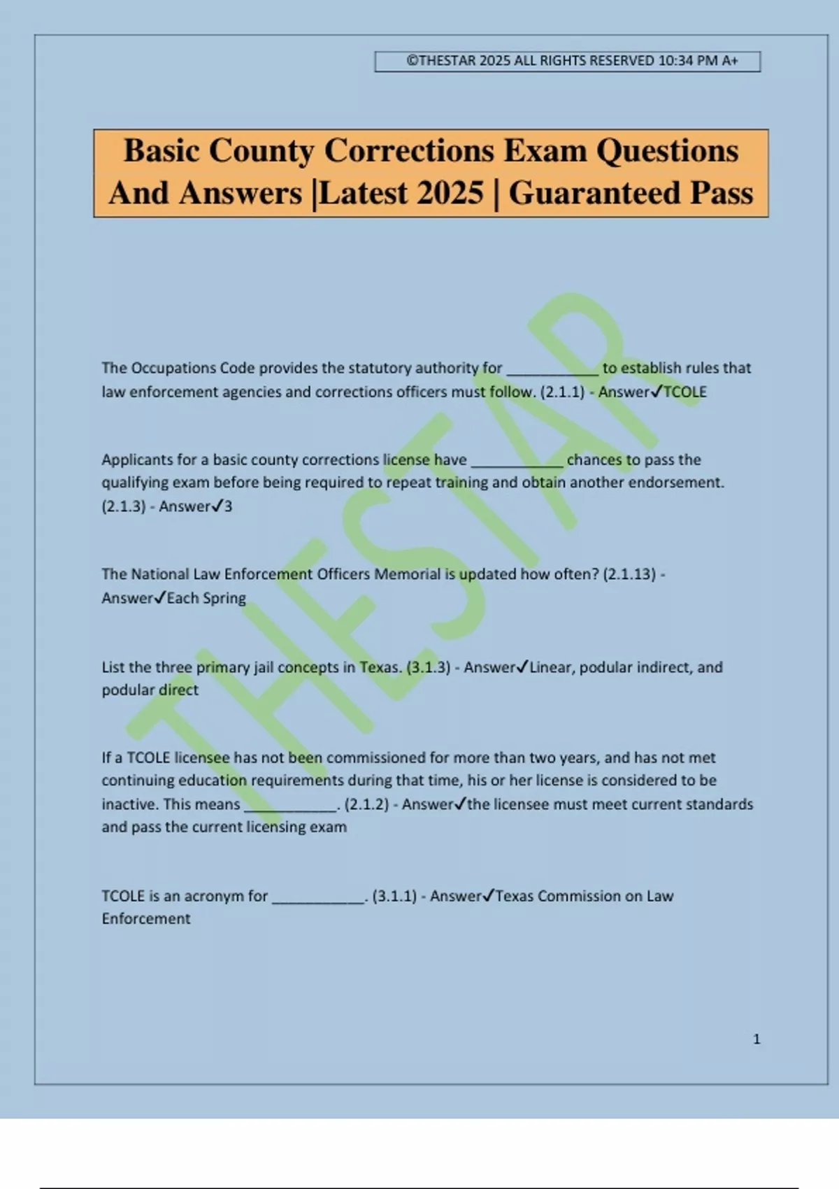 ©THESTAR 2025 ALL RIGHTS RESERVED 10:34 PM A+ 1 Basic County Corrections Exam Questions And Answers |Latest 2025 | Guaranteed Pass The Occupations Code provides the statutory authority for ___________ to establish rules that law enforcement agencies and corrections officers must follow. (2.1.1) - AnswerTCOLE Applicants for a basic county corrections license have ___________ chances to pass the qualifying exam before being required to repeat training and obtain another endorsement. (2.1.3) - Answer3 The National Law Enforcement Officers Memorial is updated how often? (2.1.13) - AnswerEach Spring List the three primary jail concepts in Texas. (3.1.3) - AnswerLinear, podular indirect, and podular direct If a TCOLE licensee has not been commissioned for more than two years, and has not met continuing education requirements during that time, his or her license is considered to be inactive. This means ___________. (2.1.2) - Answerthe licensee must meet current standards and pass the current licensing exam TCOLE is an acronym for ___________. (3.1.1) - AnswerTexas Commission on Law Enforcement ©THESTAR 2025 ALL RIGHTS RESERVED 10:34 PM A+ 2 TCOLE is responsible for implementing curriculum, prosecuting officer violations, and maintaining the officer assistance system. (3.1.1) - AnswerFalse The written petition for contesting information in termination report must be received within ________________. (2.1.11) - Answer30 days There are two _______ month periods in the training cycle. (2.1.7) - Answer24 The two primary supervision styles utilized in jails include _________________ and ________________. (3.1.4) - AnswerDirect/ indirect Which chapter of the Texas Administrative Code Part 7 lists the requirements for inclusion on the Memorial Monument? (2.1.13) - Answer229 The ___________ jail design focuses on enhancing interaction between staff and inmates and on making the staff-inmate ratio more cost-effective. (3.1.3) - AnswerPodular Direct The legal ramifications of not updating a file can result in both criminal liability and civil liability. (6.1.5) - AnswerTrue Refusing to give your name, residence address, or date of birth to a peace officer who has made a lawful arrest and request is a violation of Ch. 38.02 of the Penal Code entitled ___________. (6.2.1) - AnswerFailure to identify When describing an inmate's engagement ring during intake inventory, which of the following characteristic should you NOT include in your report? (6.4.2) - AnswerGem Name Which of the following is a purpose of the Suicide Screening Form? (5.3.4) - Answer- Triage those at risk for suicide - Identify inmates possibly in distress from psychosis ©THESTAR 2025 ALL RIGHTS RESERVED 10:34 PM A+ 3 - Assist with continuity of care of special needs inmates A ___________ is an order signed by a magistrate directing a sheriff to receive and place in jail a person so committed. (6.1.1) - AnswerCommitment Advantages to objective jail classification include all of the following, except ___________. (7.2.5) - Answerprovides a subjective classification of inmates Female inmates shall be ___________ by sight and sound from male inmates. (7.2.2) - AnswerSeparated If a jailer is trusting and familiar with the inmates, the inmates will place this jailer in the _________ category. (11.6.3) - AnswerSoft When completing fingerprinting, the option to submit to ___________ must be checked before clicking the submit button. (6.2.4) - AnswerDPS During intake procedures, if a foreign national's country of citizenship is not on the mandatory notification list, you should do which of the following? (6.7.2) - Answer-Offer to notify the inmate's consular - Inform the inmate about you making the notification - Notify the consular without delay if the inmate agrees to notification A concept that can be used to improve staff and inmate relations includes ___________. (3.1.6) - AnswerFirm but fair conduct When describing an inmate's watch during intake inventory, which of the following characteristic should you NOT include in your report? (6.4.2) - AnswerEstimated Value