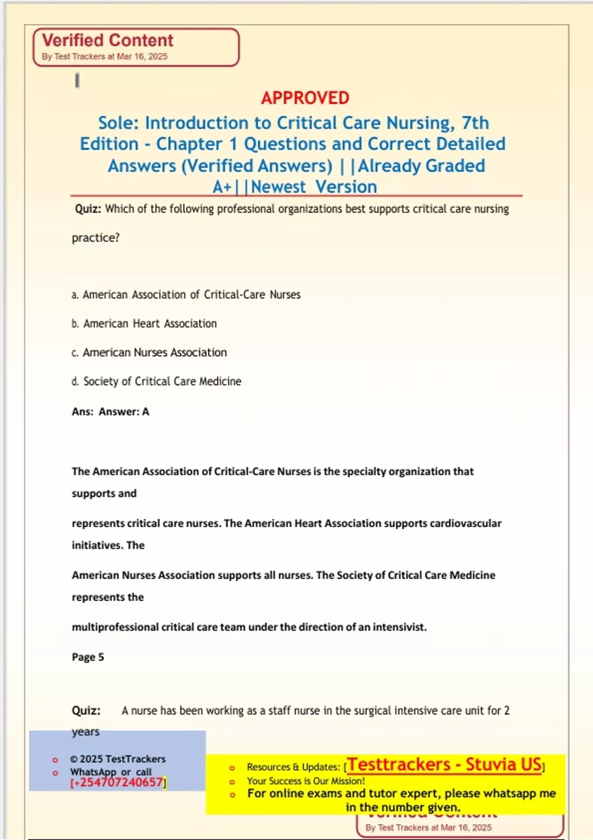 Sole: Introduction to Critical Care Nursing, 7th Edition - Chapter 1 Questions and Correct Detailed Answers (Verified Answers) ||Already Graded A+||Newest Version Quiz: Which of the following professional organizations best supports critical care nursing practice? a. American Association of Critical-Care Nurses b. American Heart Association c. American Nurses Association d. Society of Critical Care Medicine Ans: Answer: A The American Association of Critical-Care Nursesis the specialty organization that supports and represents critical care nurses. The American Heart Association supports cardiovascular initiatives. The American Nurses Association supports all nurses. The Society of Critical Care Medicine represents the multiprofessional critical care team under the direction of an intensivist. Page 5 Quiz: A nurse has been working as a staff nurse in the surgical intensive care unit for 2 years o © 2025 TestTrackers [] o Resources & Updates: [Testtrackers - Stuvia US] o Your Success is Our Mission! o For online exams and tutor expert, please me in the number given. o or call and is interested in certification. Which credential would be most applicable for the nurse to seek? a. ACNPC-AG b. CNML c. CCRN d. PCCN Ans: Answer: C The CCRN certification is appropriate for nursesin bedside practice who care for critically ill patients. The ACNPC-AG certification isfor acute care nurse practitioners. The CNML is for critical care nurse managers or leaders. The PCCN certification is for staff nurses working in progressive care, intermediate care, orstep-down unitsettings. Page 6