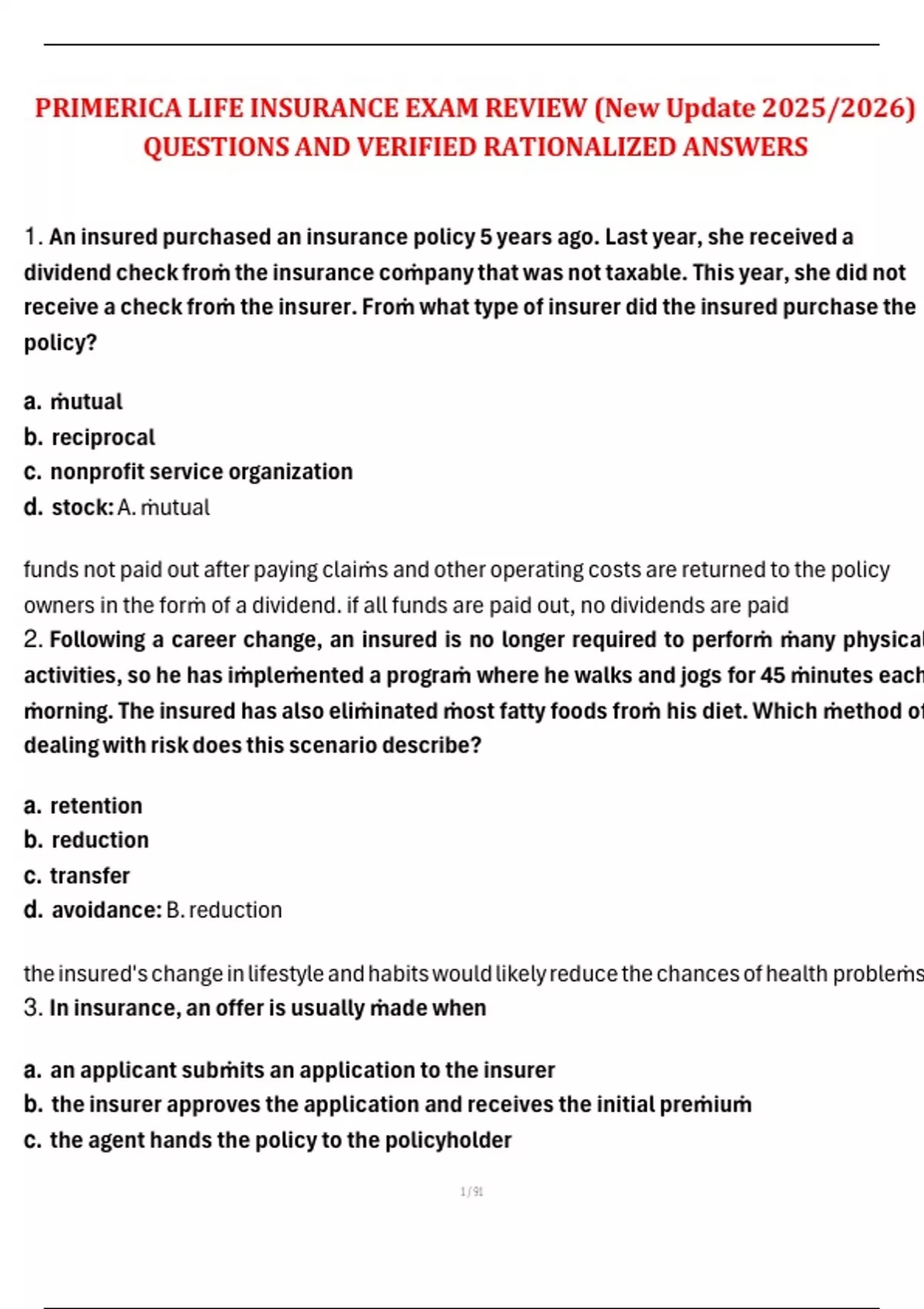 1. An insured purchased an insurance policy 5 years ago. Last year, she received a