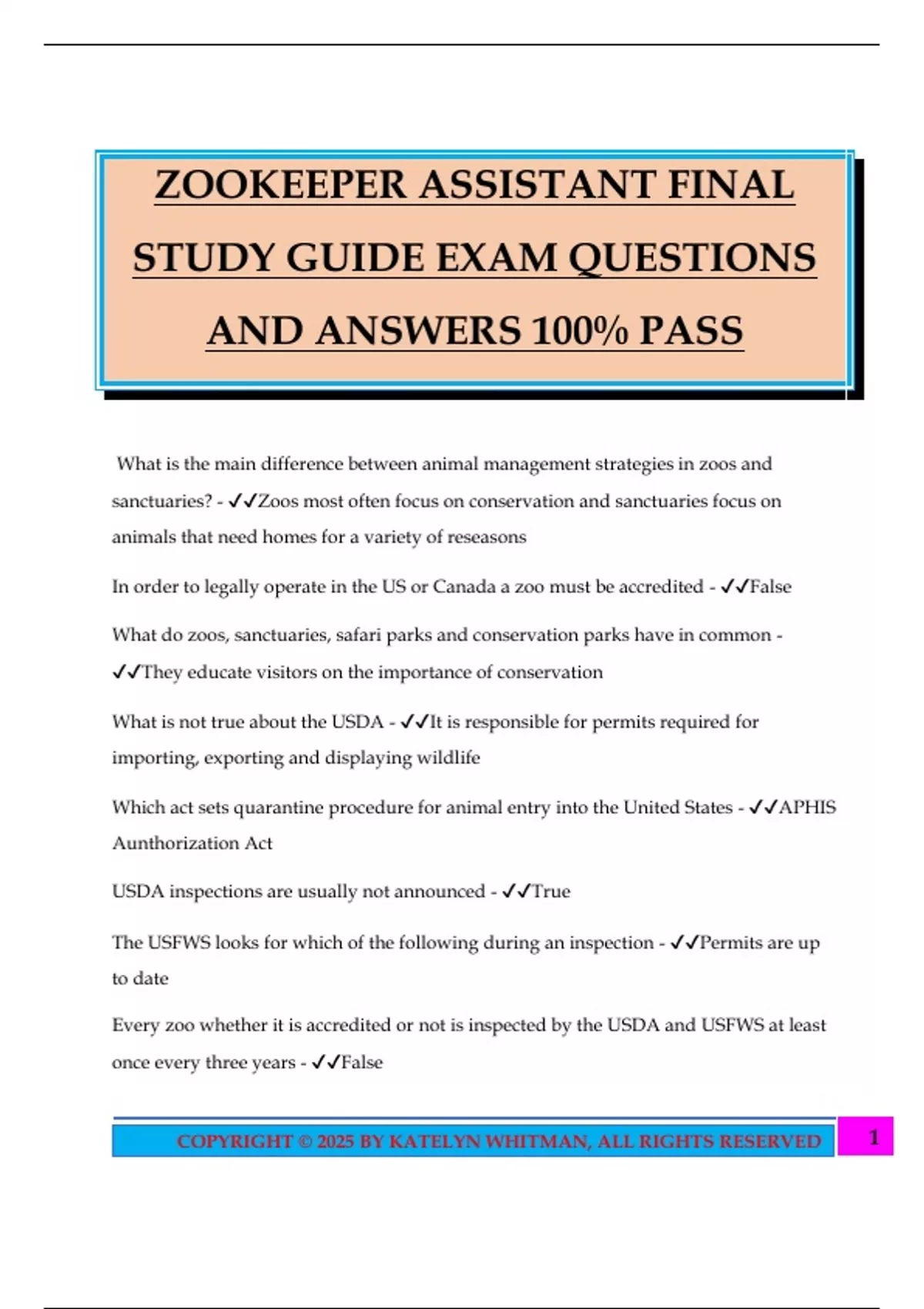 ZOOKEEPER ASSISTANT FINAL STUDY GUIDE EXAM QUESTIONS AND ANSWERS 100% PASS What is the main difference between animal management strategies in zoos and sanctuaries? - Zoos most often focus on conservation and sanctuaries focus on animals that need homes for a variety of reseasons In order to legally operate in the US or Canada a zoo must be accredited - False What do zoos, sanctuaries, safari parks and conservation parks have in common - They educate visitors on the importance of conservation What is not true about the USDA - It is responsible for permits required for importing, exporting and displaying wildlife Which act sets quarantine procedure for animal entry into the United States - APHIS Aunthorization Act USDA inspections are usually not announced - True The USFWS looks for which of the following during an inspection - Permits are up to date Every zoo whether it is accredited or not is inspected by the USDA and USFWS at least once every three years - False 2COPYRIGHT © 2025 BY KATELYN WHITMAN, ALL RIGHTS RESERVED In the US, which organization(s) ensure safe and humane animal transport by air - IATA and LAR The only regulatory agencies that influence the way a zoo is run in the US are the USDA and USFWS - False Which of the following is not an accreditation agency - United States fish and wildlife service Which facility became known as the first scientific zoo - The London zoo In 1907 William Temple created the first African plains scene and an arctic panorama using moats for part of the enclosure barriers - False Which US state passed an anti-cruelty law in 1835 - Massachusetts Animal welfare groups believe that animals - Can be used to the benefit of humans as long as they are treated humanely Which of the following is not an animal welfare group - Animal Justice Project What information would not usually be included in records zookeepers keep - Number of children visiting an animals enclosure Zookeepers are rarely involved in maintaining animals health and well being - False Zookeepers are responsible for managing species survival plans - False Zookeepers can make presentations to the public by - -Holding keeper chats, where they talk about a certain species. - answering visitor questions A facility will most likely NOT consider which of the following when hiring a zookeeper - Headshots 3COPYRIGHT © 2025 BY KATELYN WHITMAN, ALL RIGHTS RESERVED The AZA developed the species survival plan (SSP) to manage cooperative breeding programs - True A zookeepers tasks could include - Giving public presentations and enclosure cleaning and maintenance What will zookeepers spend the most time of their day doing - Cleaning Training zoo animals - -provides them with enrichment -helps make routine veterinary procedure less stressful -makes many husbandry tasks easier Staffing and position responsibilities are exactly the same in