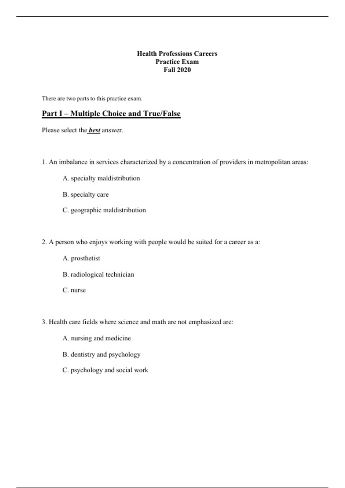 This is an exam for a course on healthcare careers.