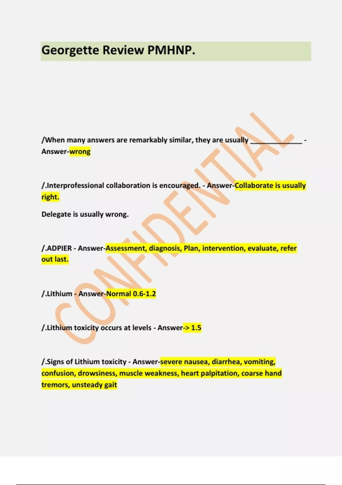 Georgette Review PMHNP. /When many answers are remarkably similar, they are usually _____________ - Answer-wrong /.Interprofessional collaboration is encouraged. - Answer-Collaborate is usually right. Delegate is usually wrong. /.ADPIER - Answer-Assessment, diagnosis, Plan, intervention, evaluate, refer out last. /.Lithium - Answer-Normal 0.6-1.2 /.Lithium toxicity occurs at levels - Answer-> 1.5 /.Signs of Lithium toxicity - Answer-severe nausea, diarrhea, vomiting, confusion, drowsiness, muscle weakness, heart palpitation, coarse hand tremors, unsteady gait /.Lithium is gold standard for - Answer-MANIA /.Lithium has evidence shown to - Answer-reduce suicidal ideation /.What does lithium cause in neonate, especially 1st trimester - Answer-Ebstein anomaly (congenital heart defect) /.dehydration and hyponatremia cause lithium levels to - Answer-rise /.Baseline labs before initiation of lithium - Answer-TSH creatinine (0.6-1.2) BUN (10-20) HCG (all psychotropics females 12-51) EKG 50+ Urinalysis (check for proteins, 4+ may indicate kidney disease) /.Side Effects of Lithium - Answer-hypothyroidism coase hand tremors with toxicity maculopapular rash diarrhea, vomiting, cramps--signs of toxicity. Monitor closely. anorexia t wave inversions leukocytosis /.Pt education for lithimum - Answer-staying hydrated avoiding NSAIDS compliance /.Depakote normal level - Answer-50-125 /.Depakote toxicity level - Answer-greater than 150 /.Teratogenic effects of Depakote - Answer-spina bifida /.Adverse effects of depakote - Answer-alopecia hepatotoxicity (RUQ pain or brown/red urine--order LFTs) AST 5-40, ALT 5-35, yellowing of skin or eyes, fatigue /.Signs of Depakote toxicity - Answer-disorientation, lethargy, respiratory depression, nausea/vomiting /.Intervention for depakote toxicity - Answer-DC med check level LFT ammonia /.MAOI + tyramine causes - Answer-hypertensive crisis /.Symptoms of hypertensive crisis - Answer-elevated BP sudden explosive like headache facial flushing palpitations pupillary dilation diaphoresis fever /.Hypertensive crisis occurs with MAOI + - Answer-MEPERIDINE STIMULANTS decongestants TCAs atypicals St. John's wart L-tryptophan asthma meds /.Treatment for hypertensive crisis - Answer-DC offending agent