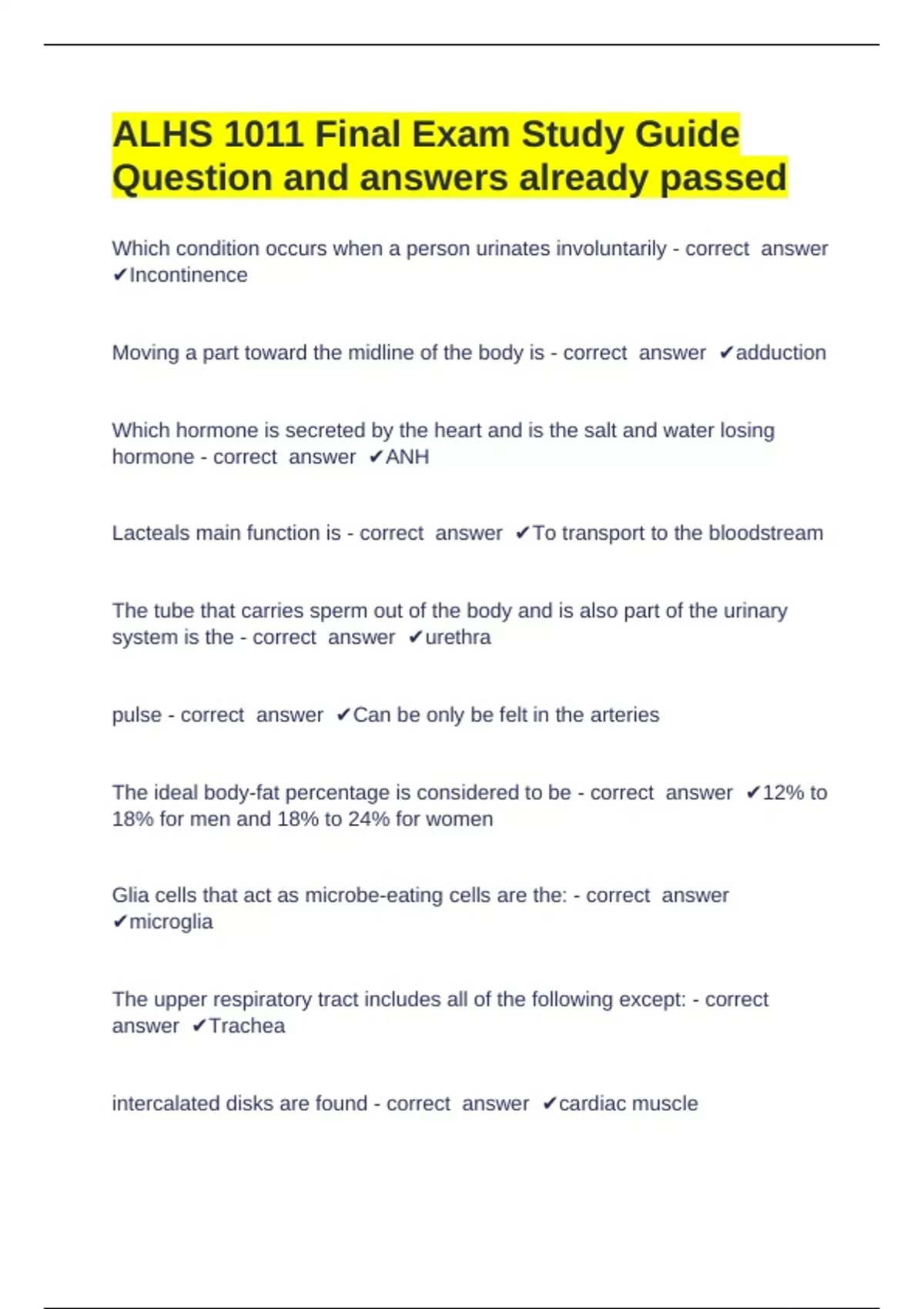 ALHS 1011 Final Exam Study Guide Question and answers already passed Which condition occurs when a person urinates involuntarily - correct answer Incontinence Moving a part toward the midline of the body is - correct answer adduction Which hormone is secreted by the heart and is the salt and water losing hormone - correct answer ANH Lacteals main function is - correct answer To transport to the bloodstream The tube that carries sperm out of the body and is also part of the urinary system is the - correct answer urethra pulse - correct answer Can be only be felt in the arteries The ideal body-fat percentage is considered to be - correct answer 12% to 18% for men and 18% to 24% for women Glia cells that act as microbe-eating cells are the: - correct answer microglia The upper respiratory tract includes all of the following except: - correct answer Trachea