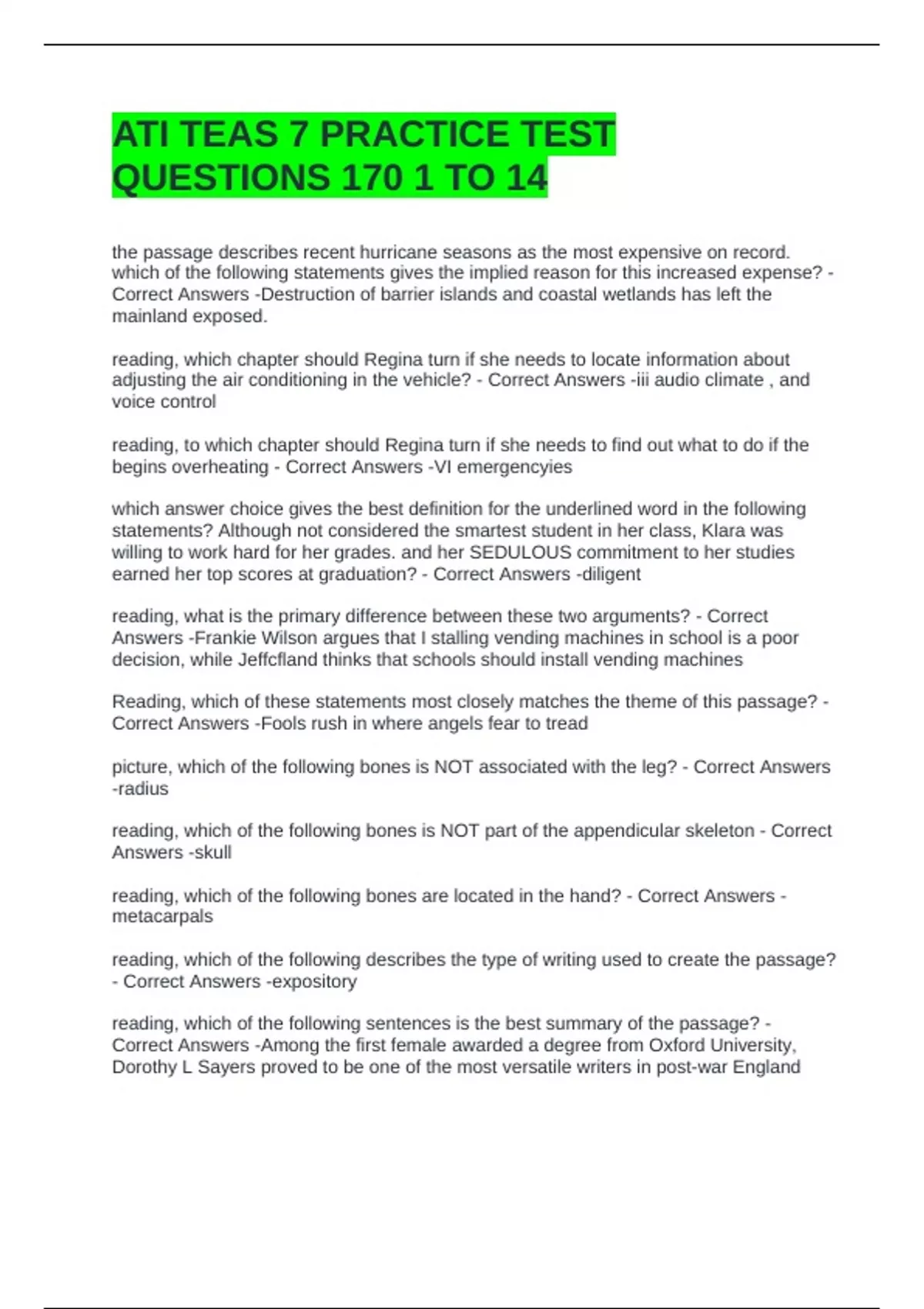 ATI TEAS 7 PRACTICE TEST QUESTIONS 170 1 TO 14 QUESTIONS AND ANSWERS