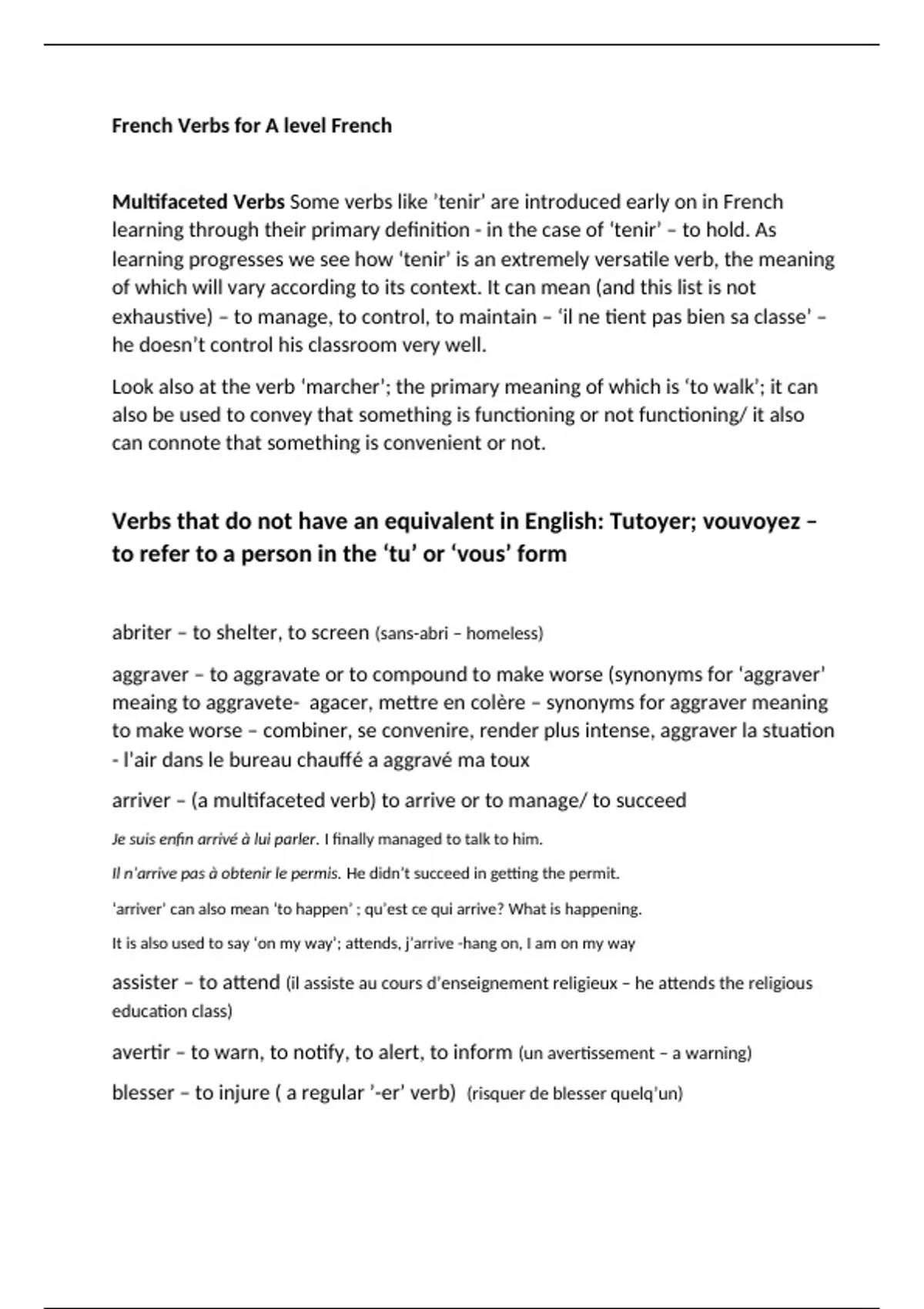 A LEVEL REVISION NOTES A LEVEL FRENCH verbs: multifaceted; conjugations; idiomatic uses