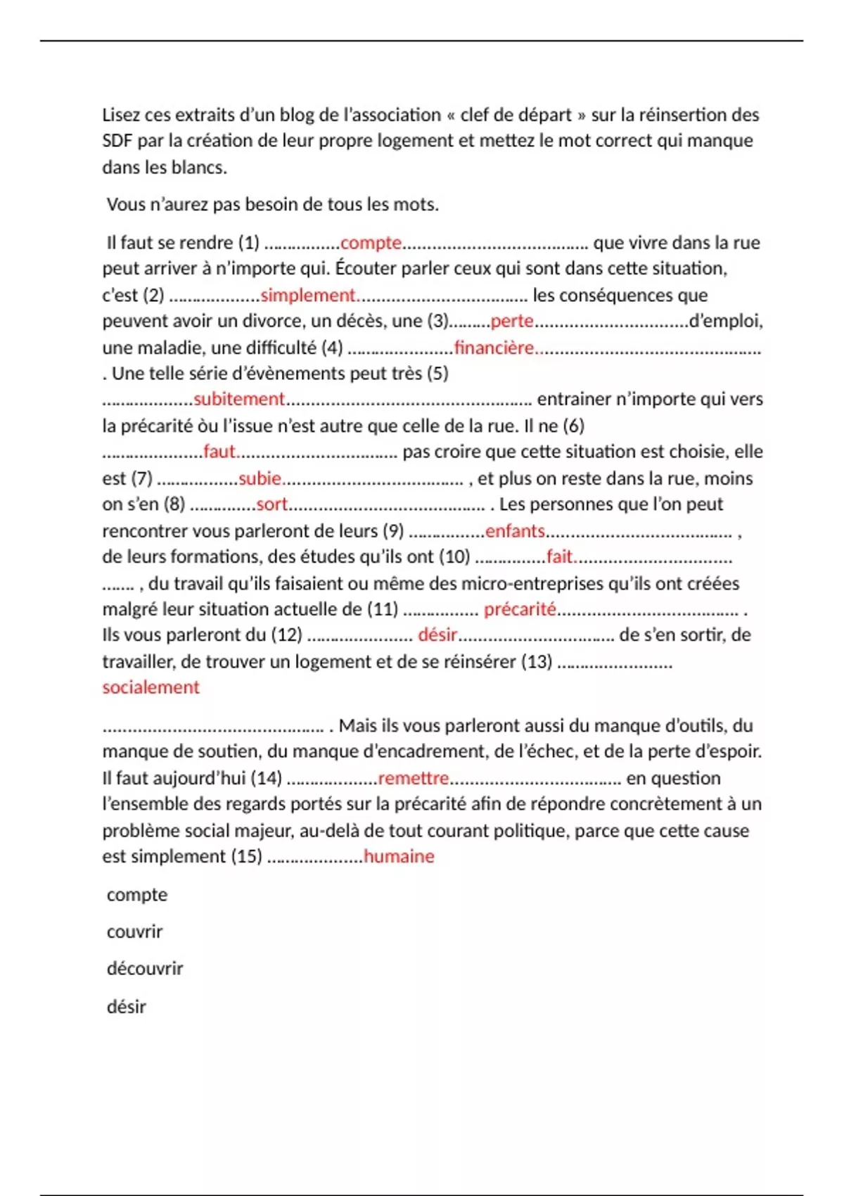 SDF par la création de leur propre logement et mettez le mot correct qui manque