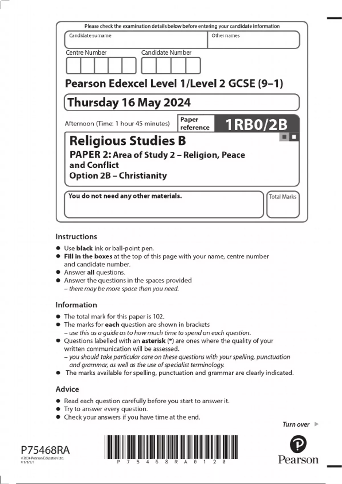2024 Pearson Edexcel Level 1/Level 2 GCSE (9–1)Religious Studies B PAPER 2: Area of Study 2 – Religion, Peace and Conflict Option 2B – Christianity QUESTION PAPER WITH FINAL MARKING SCHEME 100% VERIFIED