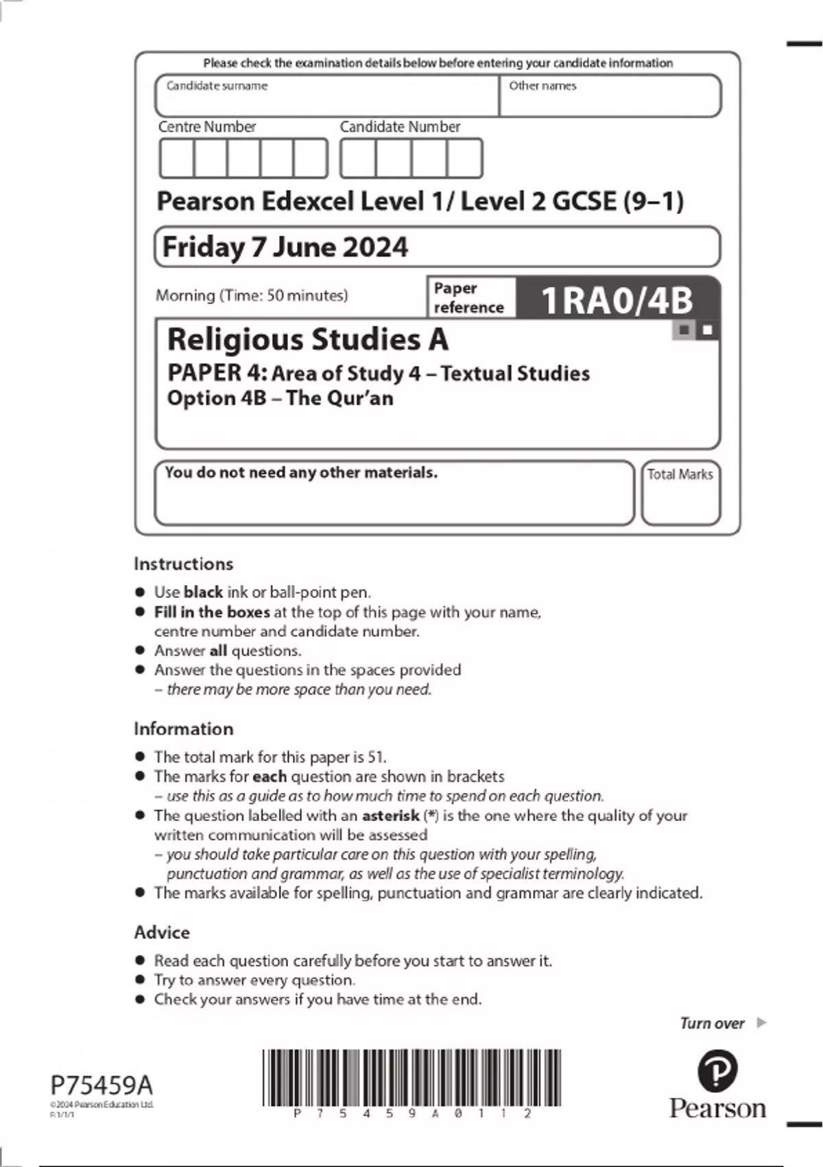 2024 Pearson Edexcel Level 1/ Level 2 GCSE (9–1) Religious Studies A PAPER 4: Area of Study 4 – Textual Studies Option 4B – The Qur’an QUESTION PAPER WITH FINAL MARKING SCHEME 100% VERIFIED