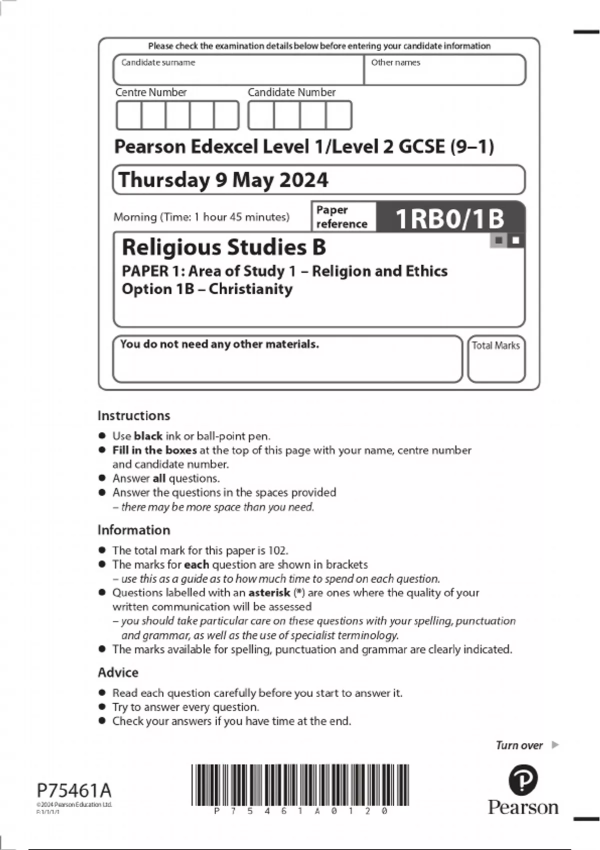 2024 Pearson Edexcel Level 1/Level 2 GCSE (9–1) Religious Studies B PAPER 1: Area of Study 1 – Religion and Ethics Option 1B – Christianity QUESTION PAPER WITH FINAL MARKING SCHEME 100% VERIFIED